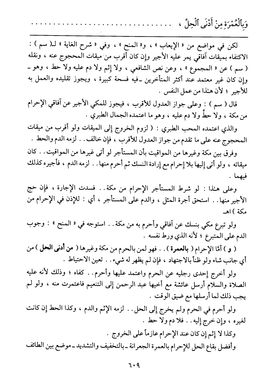 (و) أمَّا الإحرام (بالعمرة) .. فهو لمن بالحرم من مكة وغيرها (من أدنى الحل) من أي جانب شاء ولو ظناً بالاجتهاد، فإن لم يظهر له شيء .. تعين الاحتياط.