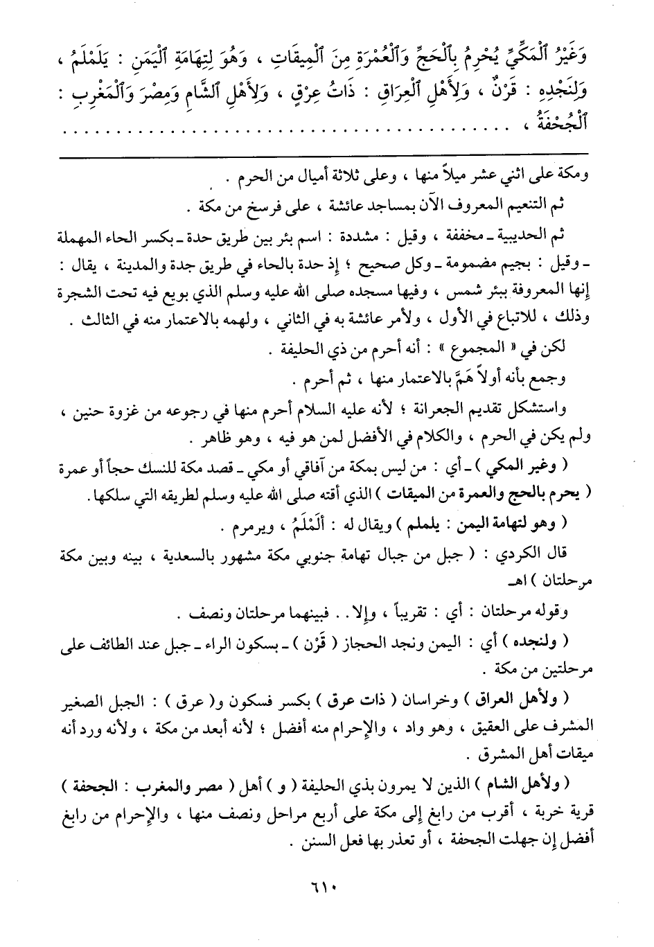 (ولأهل الشام) الذين لا يمرون بذي الحليفة (و) أهل (مصر والمغرب: الجحفة) قرية خربة، أقرب من رابغ إلى مكة على أربع مراحل ونصف منها، والإحرام من رابغ أفضل إن جهلت الجحفة، أو تعذر بها فعل السنن.