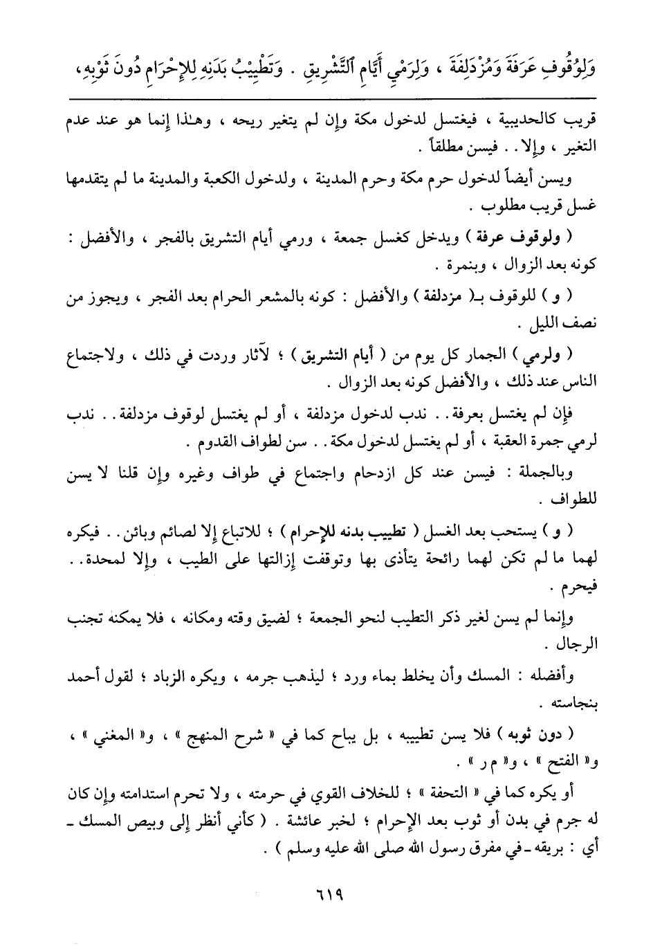 فإن لم يغتسل بعرفة .. ندب لدخول مزدلفة، أو لم يغتسل لوقوف مزدلفة .. ندب لرمي جمرة العقبة، أو لم يغتسل لدخول مكة .. سن لطواف القدوم.