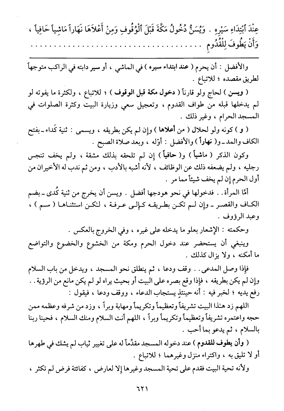 (ويسن) لحاج ولو قارناً (دخول مكة قبل الوقوف)؛ للاتباع، ولكثرة ما يفوته لو لم يدخلها قبله من طواف القدوم، وتعجيل سعي وزيارة البيت وكثرة الصلوات في المسجد الحرام، وغير ذلك.