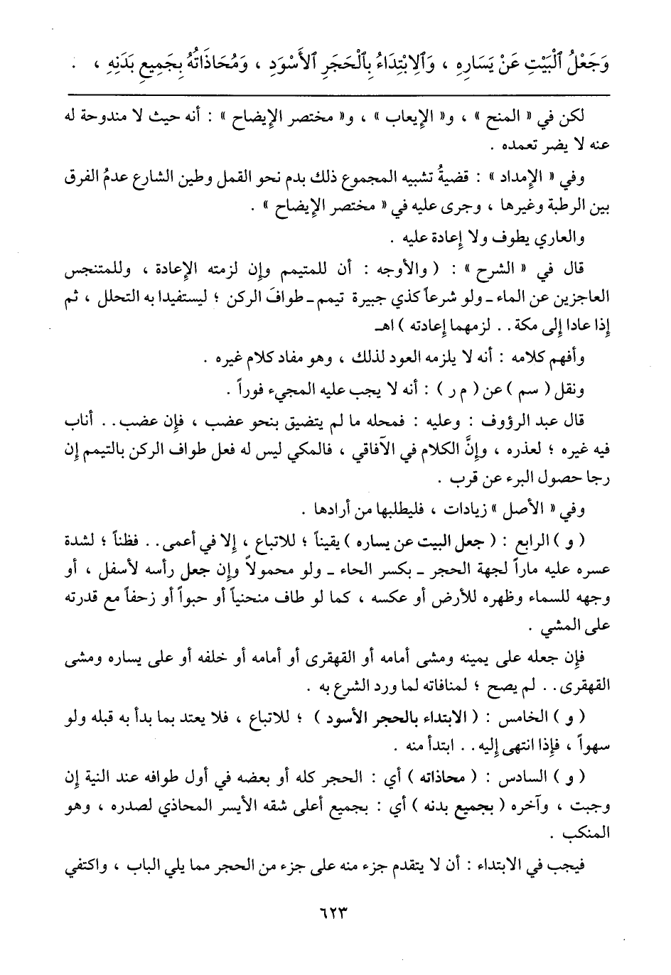(و) السادس: (محاذاته) أي: الحجر كله أو بعضه في أول طوافه عند النية إن وجبت، وآخره (بجميع بدنه) أي: بجميع أعلى شقه الأيسر المحاذي لصدره، وهو المنكب.