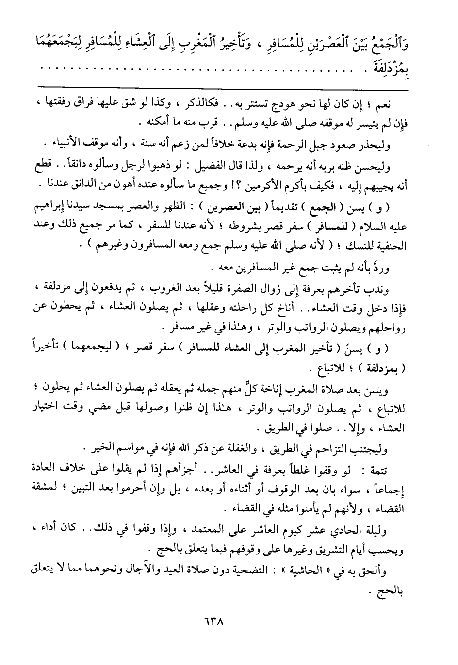 (و) يسن (الجمع) تقديماً (بين العصرين): الظهر والعصر بمسجد سيدنا إبراهيم عليه السلام (للمسافر) سفر قصر بشروطه؛ لأنه عندنا للسفر، كما مر جميع ذلك وعند الحنفية للنسك؛ (لأنه صلى الله عليه وسلم جمع ومعه المسافرون وغيرهم).