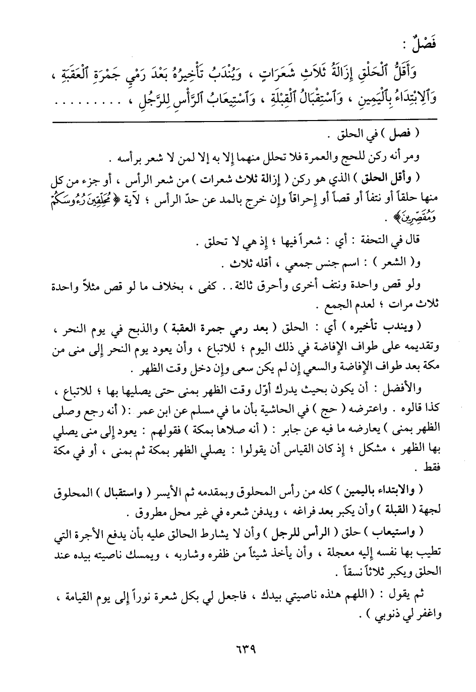 (واستيعاب) حلق (الرأس للرجل) وأن لا يشارط الحالق عليه بأن يدفع الأجرة التي تطيب بها نفسه إليه معجلة، وأن يأخذ شيئاً من ظفره وشاربه، ويمسك ناصيته بيده عند الحلق ويكبر ثلاثاً نسقاً.