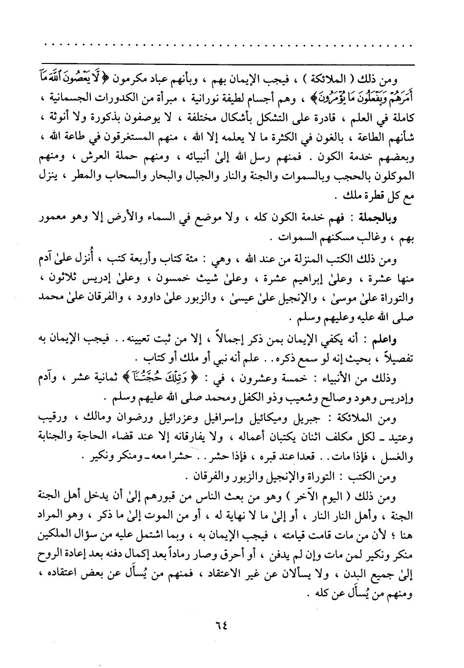ومن ذلك (الملائكة)، فيجب الإيمان بهم، وبأنهم عباد مكرمون (لا يَعْصُونَ اللَّهَ مَا أَمَرَهُمْ وَيَفْعَلُونَ مَا يُؤْمَرُونَ) [التحريم:6]، وهم أجسام لطيفة نورانية، مبرأة من الكدورات الجسمانية، كاملة في العلم، قادرة على التشكل بأشكال مختلفة، لا يوصفون بذكورة ولا أنوثة، شأنهم الطاعة، بالغون في الكثرة ما لا يعلمه إلا الله، منهم المستغرقون في طاعة الله، وبعضهم خدمة الكون. فمنهم رسل الله الى أنبيائه، ومنهم حملة العرش، ومنهم الموكلون بالحجب وبالسماوات والجنة والنار والجبال والسحاب والمطر، ينزل مع كل قطرة ملك.