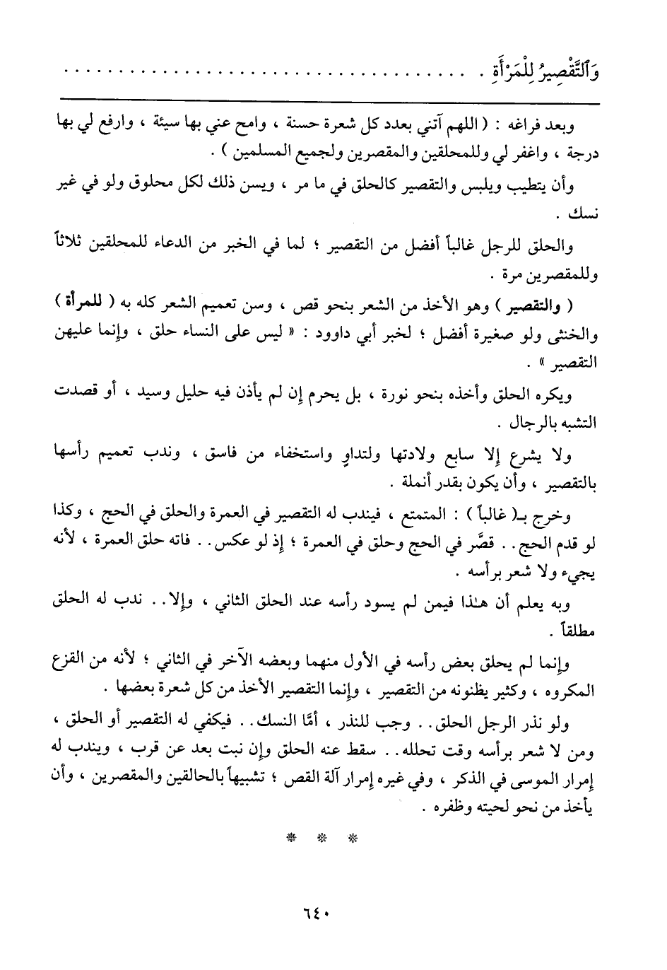 (والتقصير) هو الأخذ من الشعر بنحو قص، وسن تعميم الشعر كله به (للمرأة) والخنثى ولو صغيرة أفضل؛ لخبر أبي داوود: "ليس على النساء حلق، وإنما عليهن التقصير".
