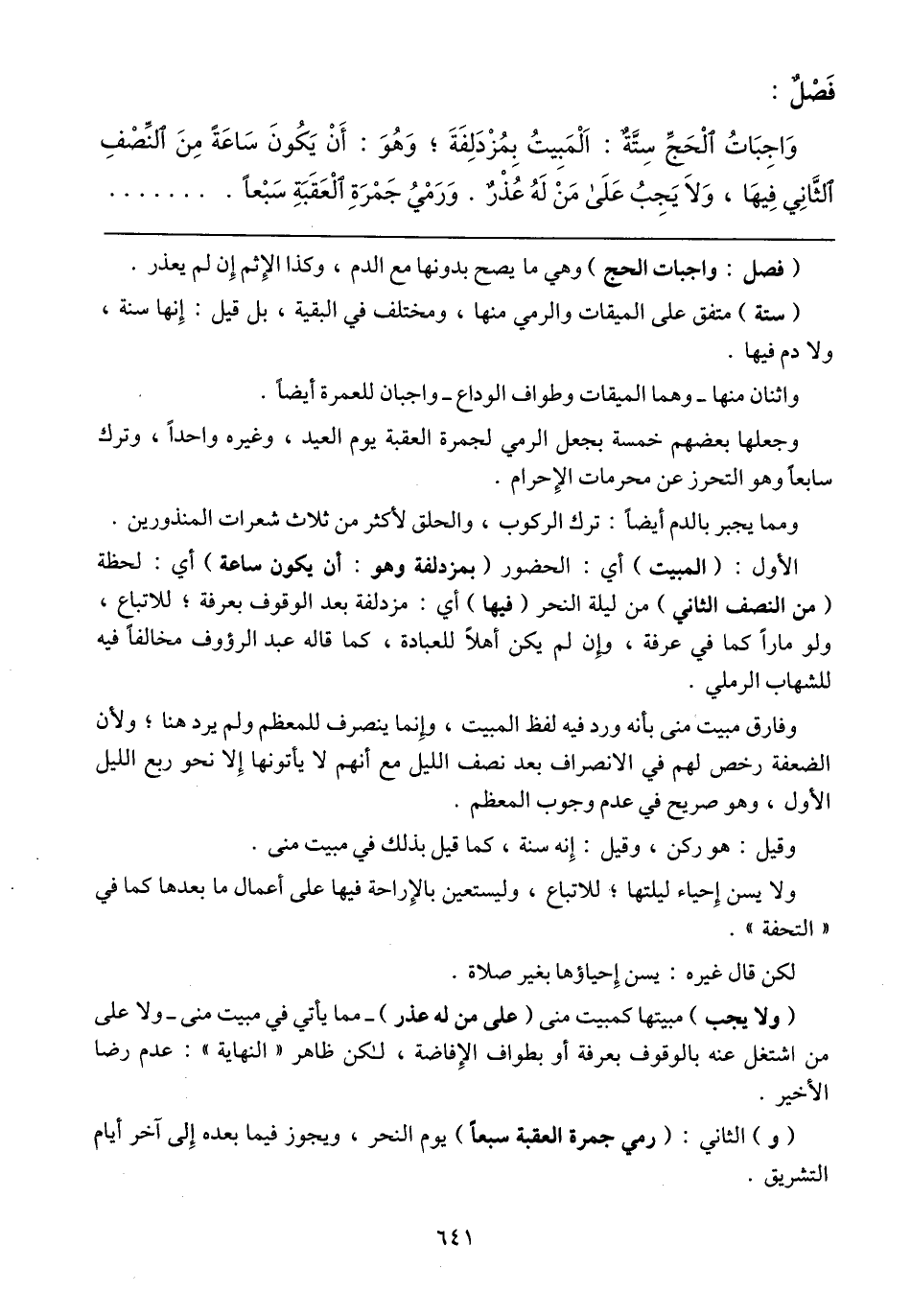 (ولا يجب) مبيتها كمبيت منى (على من له عذر) -مما يأتي في مبيت منى- ولا على من اشتغل عنه بالوقوف بعرفة أو بطواف الإفاضة، لكن ظاهر "النهاية": عدم رضا الأخير.