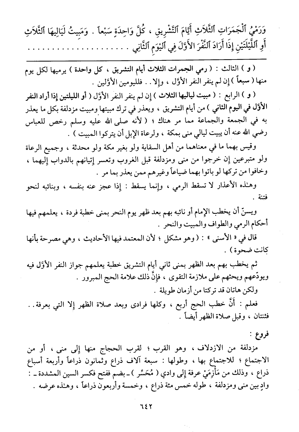 (و) الرابع: (مبيت لياليها الثلاث) إن لم ينفر النفر الأوَّل (أو الليلتين إذا أراد النفر الأوَّل في اليوم الثاني) من أيام التشريق، ويعذر في ترك مبيتها ومبيت مزدلفة بكل ما يعذر به في الجمعة والجماعة مما مر هناك؛ (لأنه صلى الله عليه وسلم رخص للعباس رضي الله عنه أن يبيت ليالي منى بمكة، ولرعاة الإبل أن يتركوا المبيت).