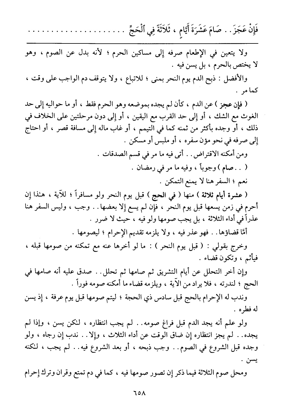 (عشرة ايام ثلاثة) منها (في الحج) قبل يوم النحر ولو مسافراً؛ للآية، هذا إن أحرم في زمن يسعها قبل يوم النحر، فإن لم يسع إلا بعضها .. وجب، وليس السفر هنا عذراً في أداء الثلاثة، بل يجب صومها ولو فيه، حيث لا ضرر.