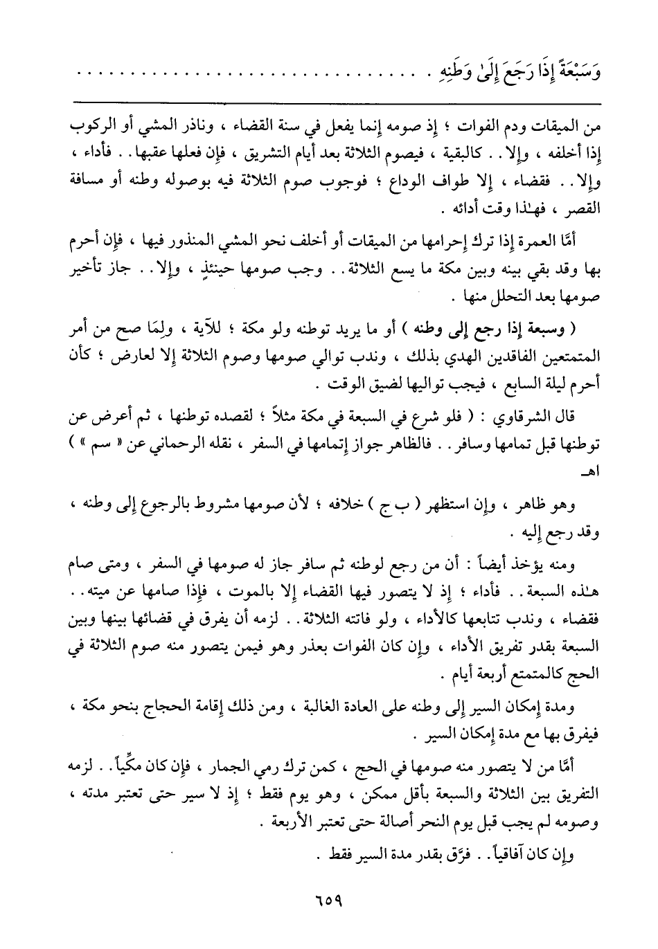 ومنه يؤخذ أيضاً: أن من رجع لوطنه ثم سافر جاز له صومها في السفر، ومتى صام هذه السبعة .. فأداء؛ إذ لا يتصور فيها القضاء إلا بالموت، فإذا صامها عن ميته .. فقضاء، وندب تتابعها كالأداء، ولو فاتته الثلاثة .. لزمه أن يفرق في قضائها بينها وبين السبعة بقدر تفريق الأداء، وإن كان الفوات بعذر وهو فيمن يتصور منه صوم الثلاثة في الحج كالمتمتع أربعة أيام.