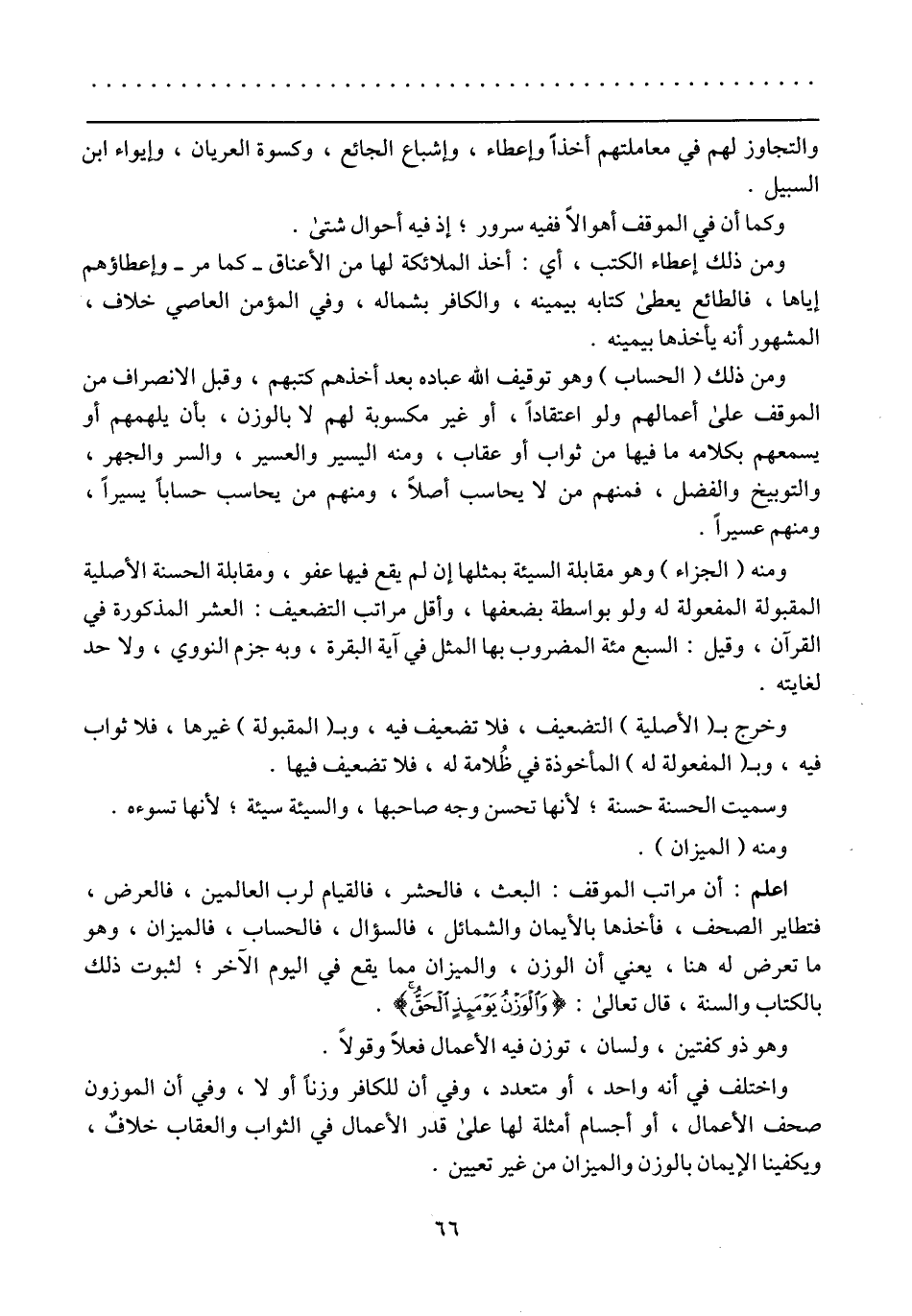 ومن ذلك (الحساب) وهو توقيف الله عباده بعد أخذهم كتبهم، وقبل الانصراف من الموقف على أعمالهم ولو اعتقاداً، أو غير مكسوبة لهم لا بالوزن، بأن يلهمهم أو يسمعهم بكلامه ما فيها من ثواب أو عقاب، ومنه اليسير والعسير، والسر والجهر، والتوبيخ والفضل، فمنهم من لا يحاسب أصلاً، ومنهم من يحاسب حساباً يسيراً، ومنهم عسيراً.