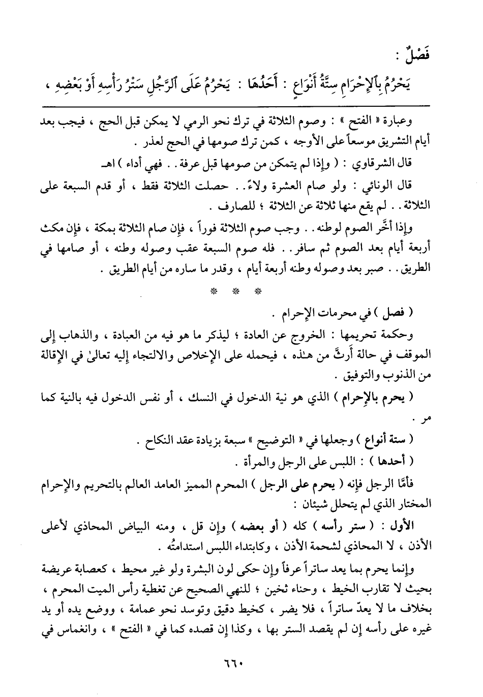 الأول: (ستر رأسه) كله (أو بعضه) وإن قل، ومنه البياض المحاذي لأعلى الأذن، لا المحاذي لشحمة الأذن، وكابتداء اللبس استدامتُه.