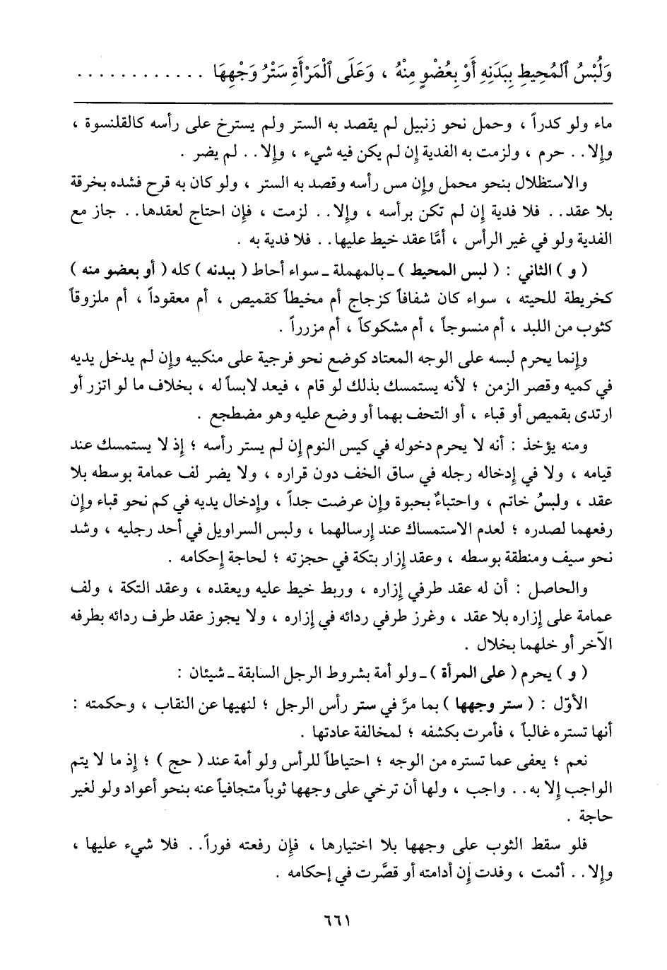 (و) الثاني: (لبس المحيط) -بالمهملة- سواء أحاط (ببدنه) كله (أو بعضو منه) كخريطة للحيته، سواء كان شفافاً كزجاج أم مخيطاً كقميص، أم معقوداً، أم ملزوقاً كثوب من اللبد، أم منسوجاً، أم مشكوكاً، أم مزرراً.