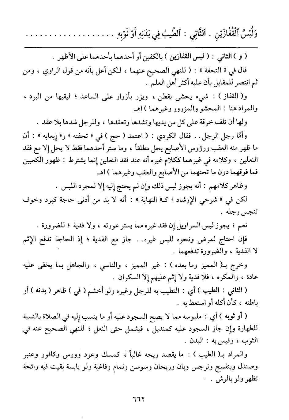 (الثاني: الطيب) أي: التطيب به للرجل وغيره ولو أخشم (في) ظاهر (بدنه) أو باطنه، كأن أكله أو استعط به.