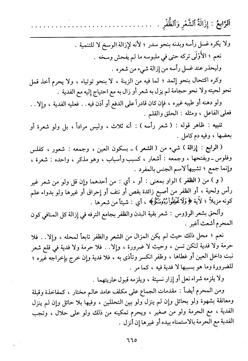 (الرابع: إزالة) شيء من (الشعر) -بسكون العين، وجمعه: شعور، كفلس وفلوس- وبفتحها، وجمعه أشعار، كسبب وأسباب، وهو مذكر، واحده: شعرة، وإنما جمع؛ تشبيهاً لاسم الجنس بالمفرد.