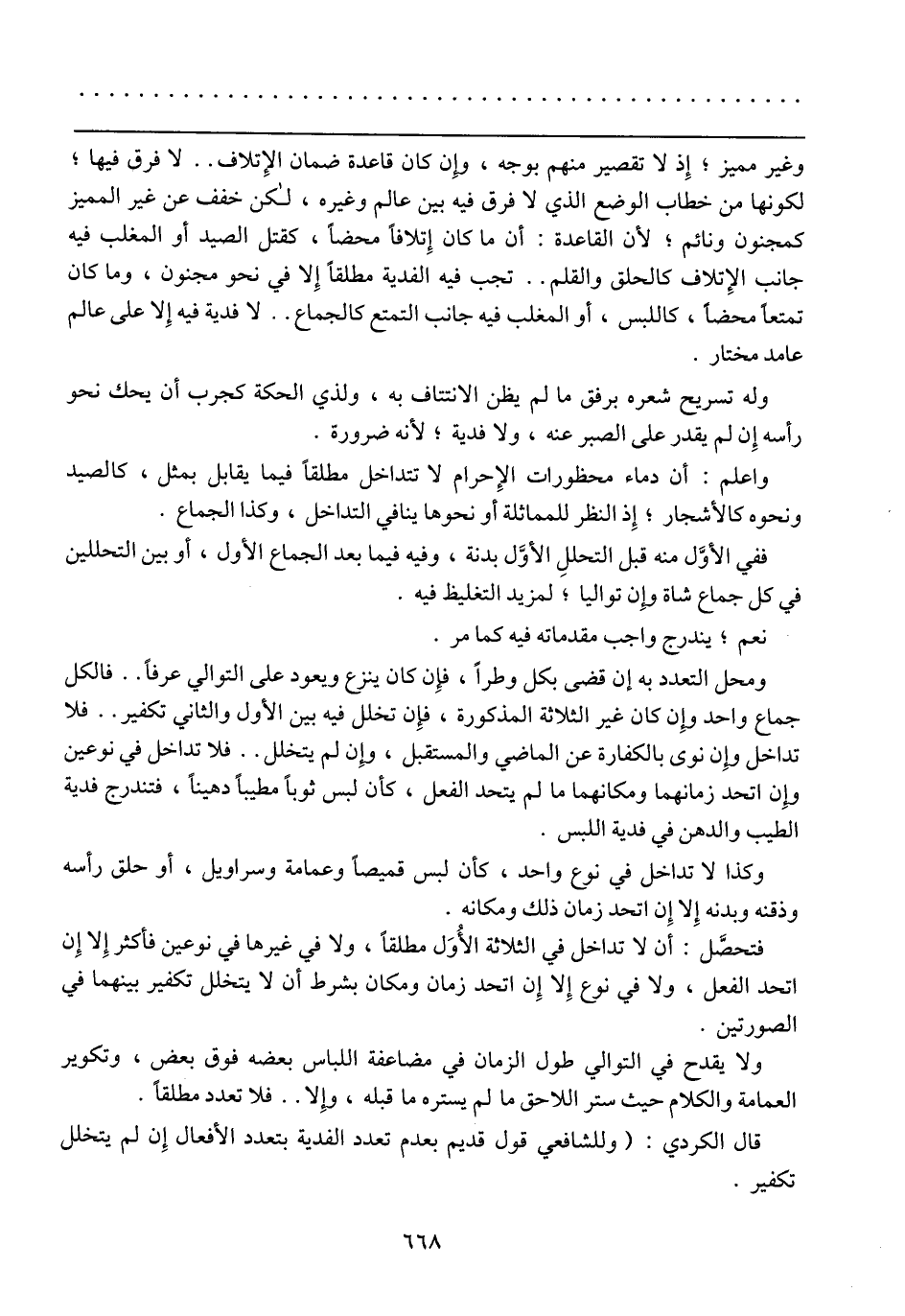 وغير مميز؛ إذ لا تقصير منهم بوجه، وإن كان قاعدة ضمان الإتلاف .. لا فرق فيها؛ لكونه من خطاب الوضع الذي لا فرق فيه بين عالم وغيره، لكن خفف عن غير المميز كمجنون ونائم؛ لأن القاعدة: أن ما كان إتلافاً محضاً، كقتل الصيد أو المغلب فيه جانب الإتلاف كالحلق والقلم .. تجب فيه الفدية مطلقاً إلا في نحو مجنون، وما كان تمتعاً محضاً، كاللبس، أو المغلب فيه جانب التمتع كالجماع .. لا فدية فيه إلا على عالم عامد مختار.