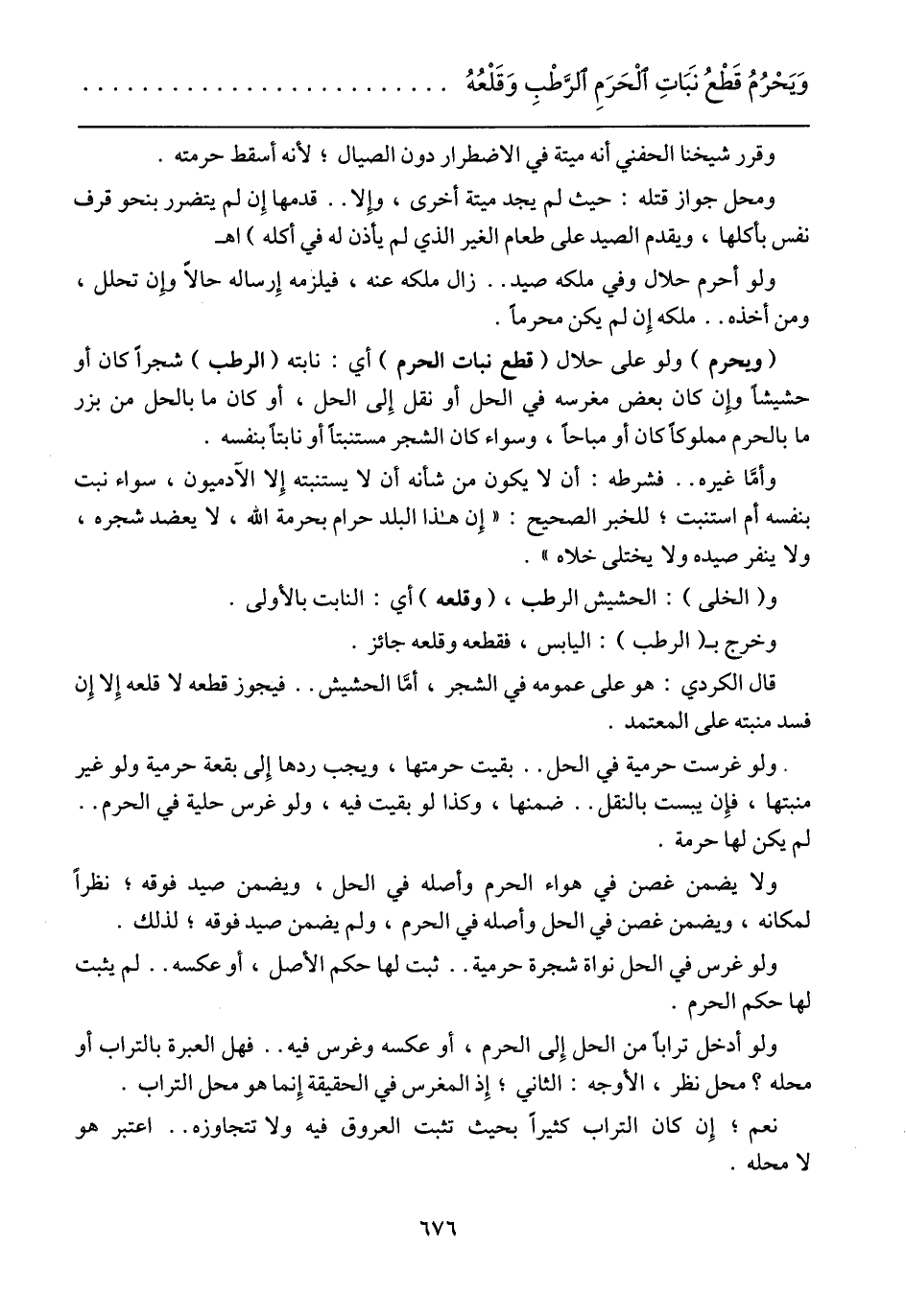 قال الكردي: هو على عمومه في الشجر، أمَّا الحشيش .. فيجوز قطعه لا قلعه إلا أن فسد منبته على المعتمد.