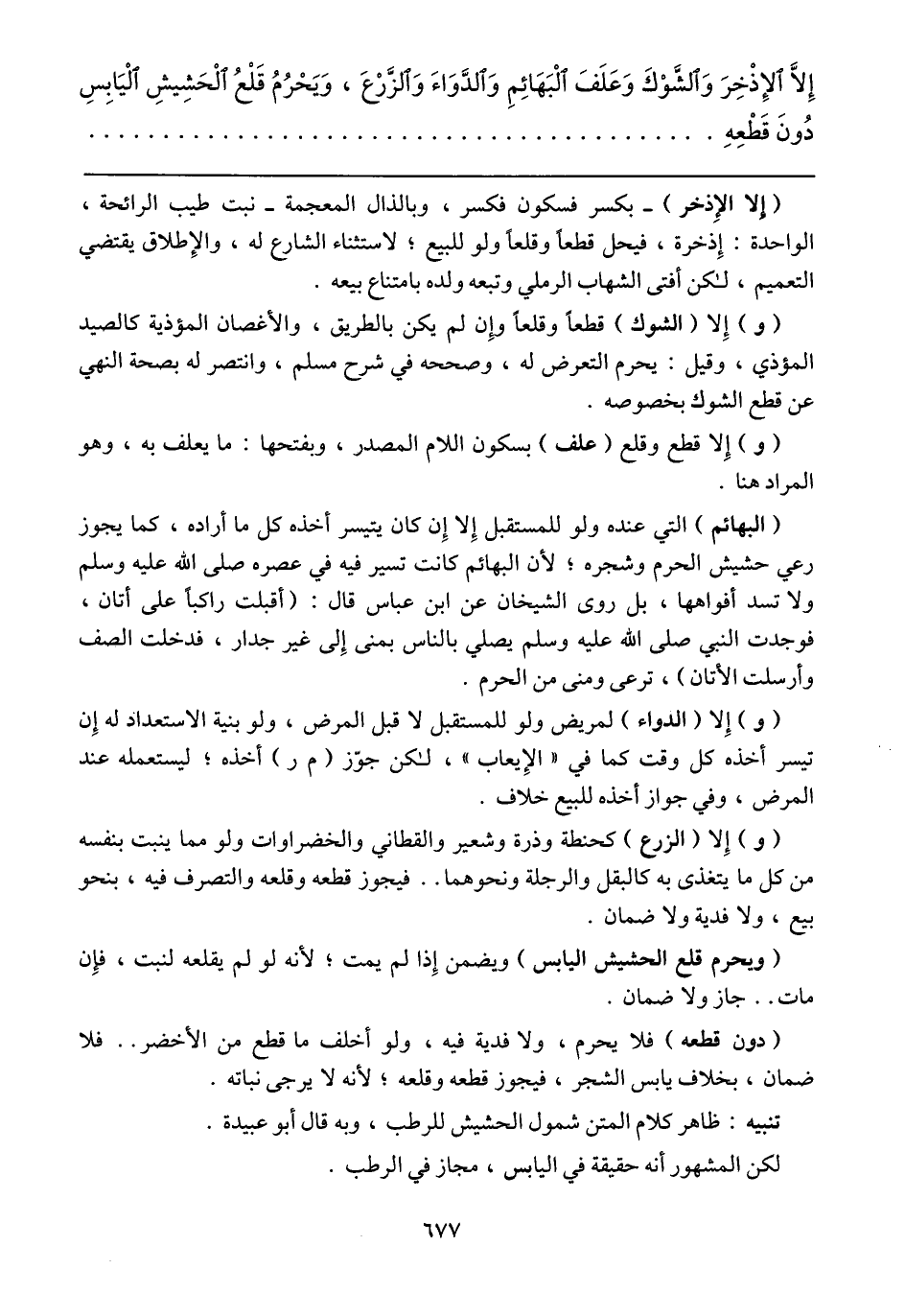 (البهائم) التي عنده ولو للمستقبل إلا إن كان يتيسر أخذه كل ما أراده، كما يجوز رعي حشيش الحرم وشجره؛ لأن البهائم كانت تسير فيه في عصره صلى الله عليه وسلم ولا تسد أفواهها، بل روى الشيخان عن ابن عباس قال: (أقبلت راكباً على أتان، فوجدت النبي صلى الله عليه وسلم يصلي بالناس بمنى إلى غير جدار، فدخلت الصف وأرسلت الأتان)، ترعى ومنى من الحرم.