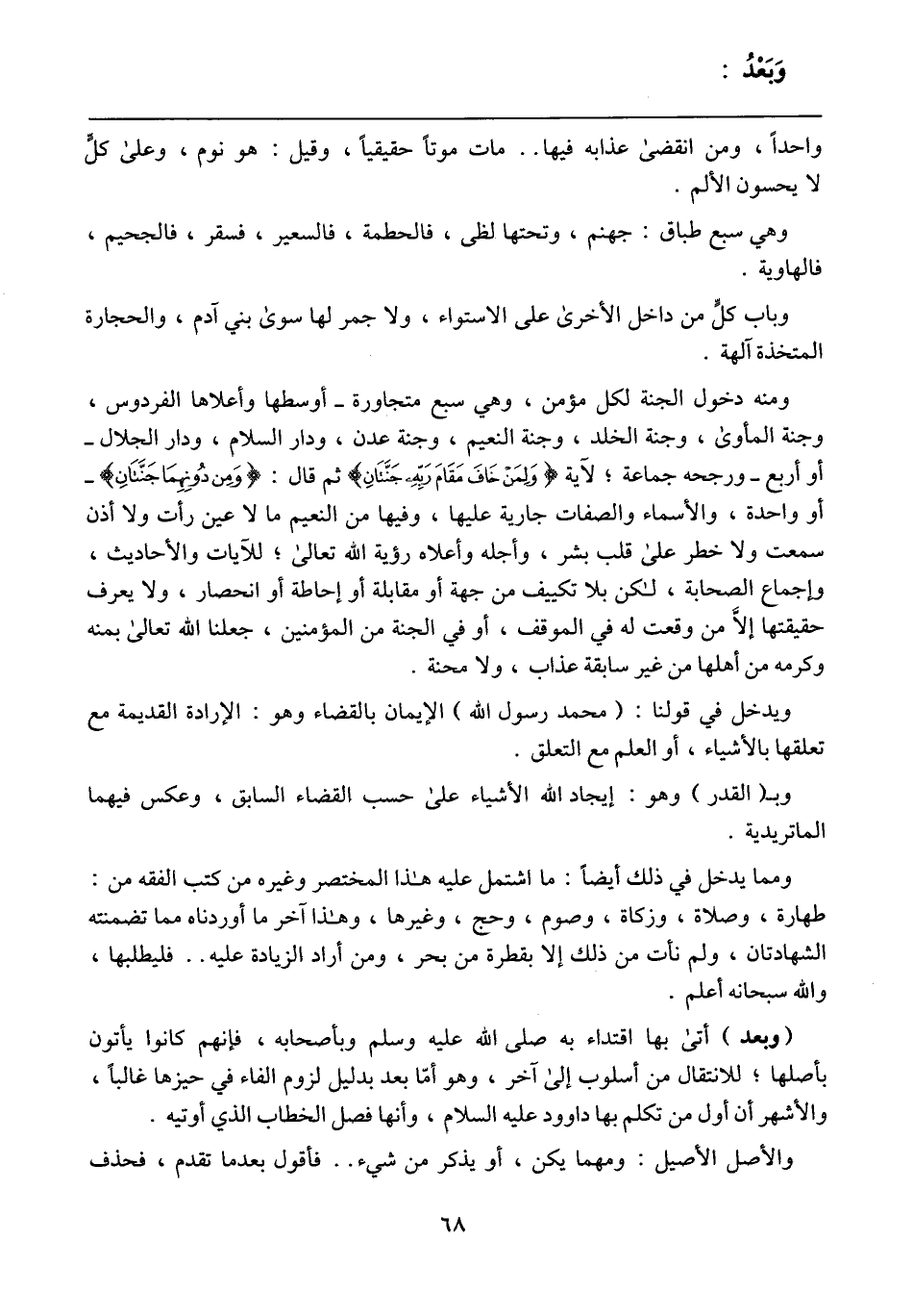 ومما يدخل في ذلك أيضاً: ما اشتمل عليه هذا المختصر وغيره من كتب الفقه من: طهارة، وصلاة، وزكاة، وصوم، وحج، وغيرها، وهذا آخر ما أوردناه مما تضمنته الشهادتان، ولم نأت من ذلك إلا بقطرة من بحر، ومن أراد الزيادة عليه .. فليطلبها، والله سبحانه أعلم.