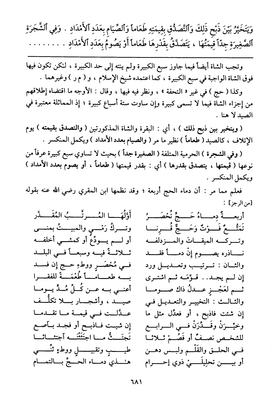 فعلم مما مر: أن دماء الحج أربعة؛ وقد نظمها ابن المقري رضي الله عنه بقوله [من الرجز]: