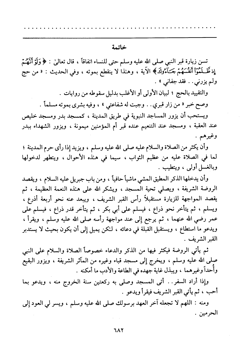 وأن يدخلها الذكر المطيق المشي ماشياً حافياً، ومن باب جبريل عليه السلام، ويقصد الروضة الشريفة، ويصلي تحية المسجد، ويشكر الله على هذه النعمة العظيمة، ثم يقصد المواجهة للزيارة مستقبلاً رأس القبر الشريف ويبعد عنه نحو أربعة أذرع، ويسلم، ثم يتأخر نحو ذراع، فيسلم على أبي بكر، ثم يتأخر قدر ذراع، فيسلم على عمر رضي الله عنهما، ثم يرجع إلى عند مواجهة رأسه صلى الله عليه وسلم، ويقرأ، ويدعو ما استطاع، ويستقبل القبلة في دعائه، لكن يميل إلى أن يكون بحيث لا يستدبر القبر الشريف.
