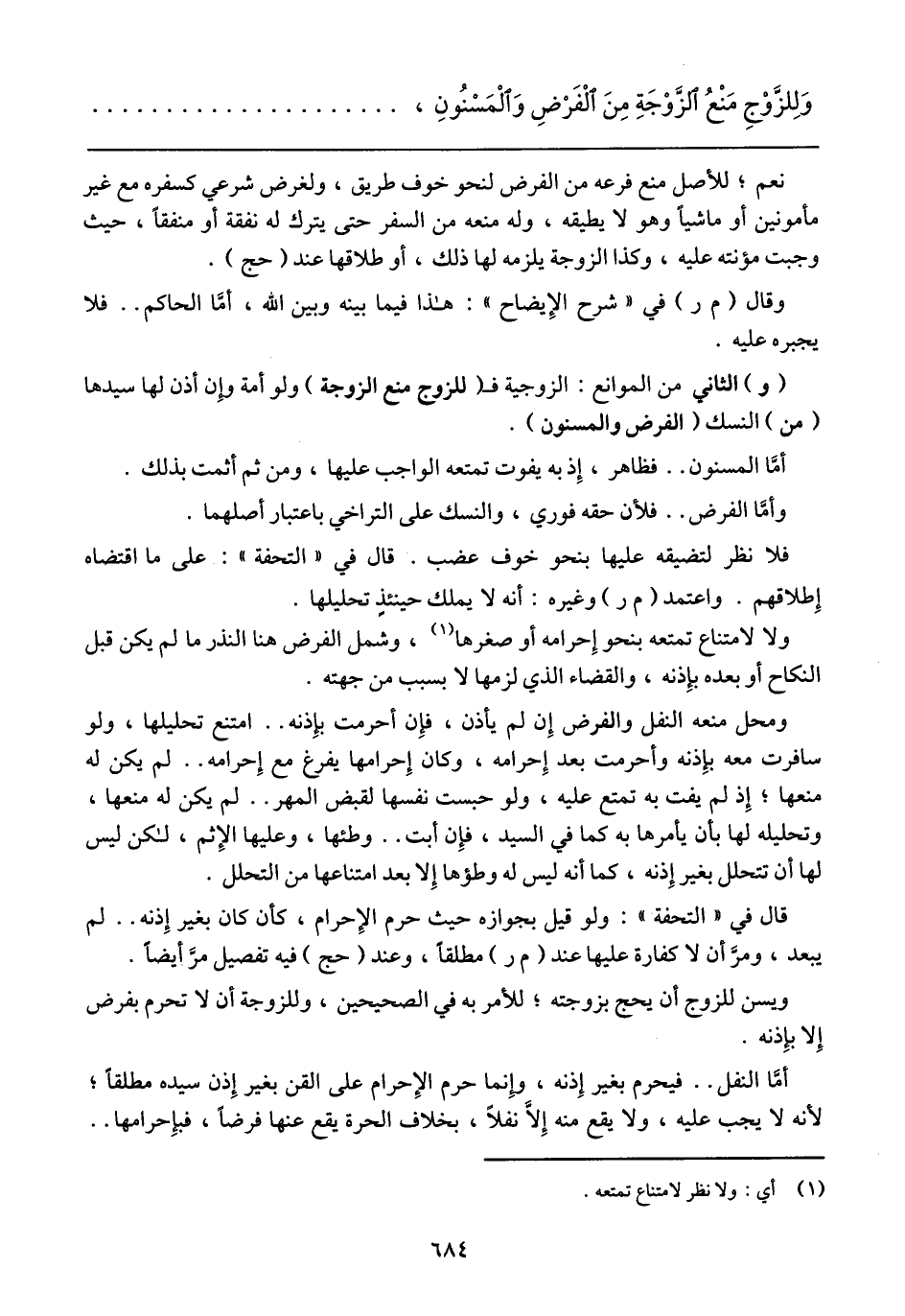ومحل منعه النفل والفرض إن لم يأذن، فإن أحرمت بإذنه .. امتنع تحليلها، ولو سافرت معه بإذنه وأحرمت بعد إحرامه وكان إحرامها يفرغ مع إحرامه .. لم يكن له منعها؛ إذ لم يفت به تمتع عليه، ولو حبست نفسها لقبض المهر .. لم يكن له منعها، وتحليله لها بأن يأمرها به كما في السيد، فإن أبت .. وطئها، وعليها الإثم، لكن ليس لها أن تتحلل بغير إذنه، كما أنه ليس له وطؤها إلا بعد امتناعها من التحلل.