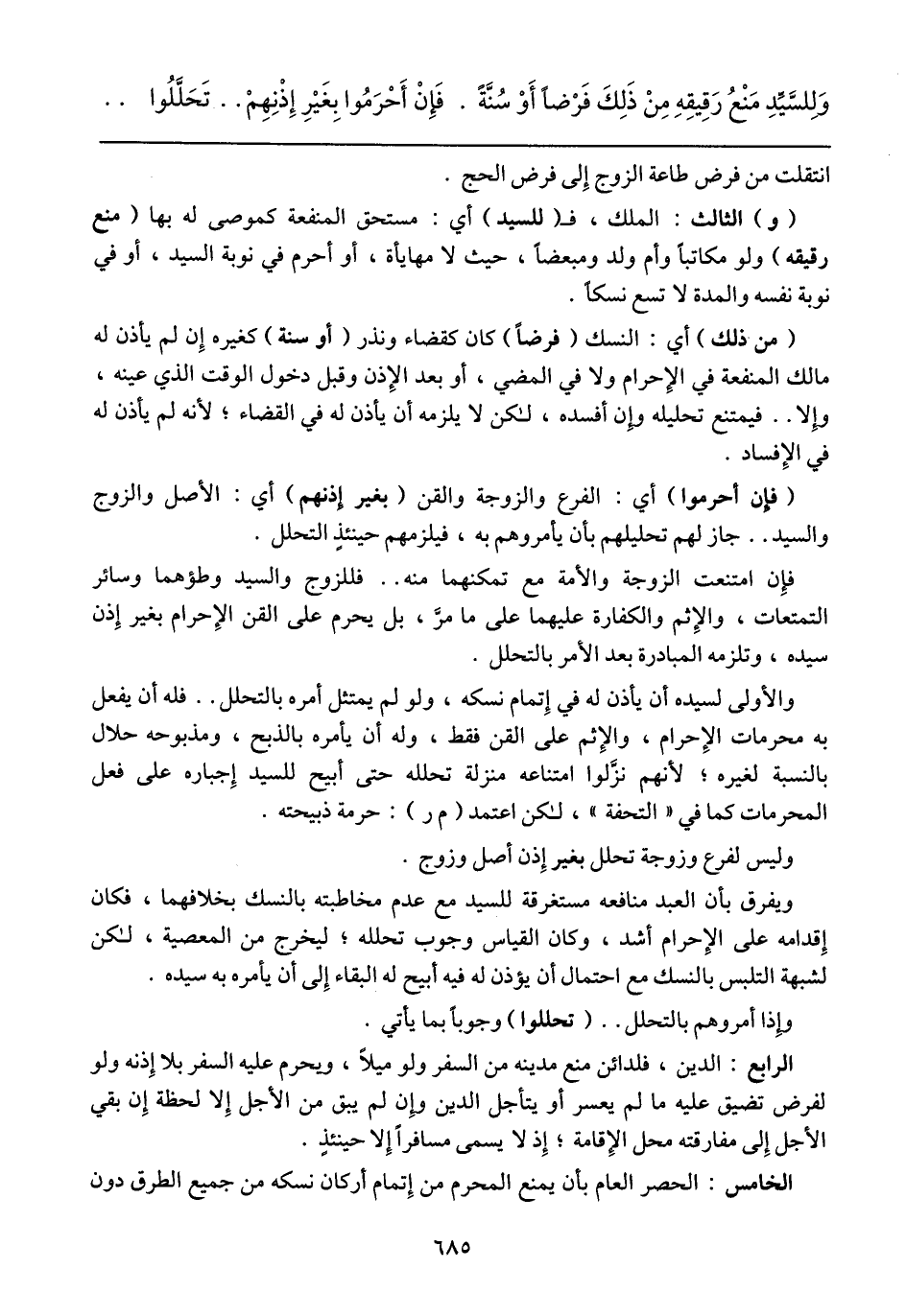 فإن امتنعت الزوجة والأمة مع تمكنهما منه .. فللزوج والسيد وطؤهما وسائر التمتعات، والإثم والكفارة عليهما على ما مرَّ، بل يحرم على القن الإحرام بغير إذن سيده، وتلزمه المبادرة بعد الأمر بالتحلل.
