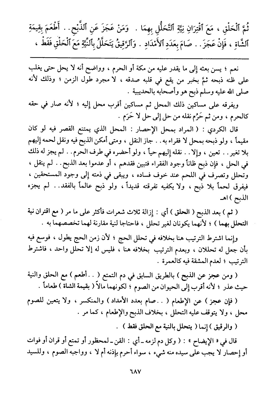 قال الكردي: (المراد بمحل الإحصار: المحل الذي يمتنع القصر فيه لو كان مقيماً، ولو ذبحه بمحل لا فقراء به .. جاز النقل، ومتى أمكن الذبح فيه ونقل لحمه إليهم بلا تغير .. تعين، وإلا .. نقله إليهم حياً، ولو أحضره في طرف الحرم .. لم يجز له ذلك في الحل، فإن ذبح ظاناً وجود الفقراء فتبين فقدهم، أو عدموا بعد الذبح .. لم ينقل، وتحلل وتصرف في اللحم عند خوف فساده، ويبقى في ذمته إلى وجود المستحقين، فيفرق لحماً بلا ذبح، ولا يكفيه تفرقته قديداً، ولو ذبح عالماً بالفقد .. لم يجزه الذبح) اهـ