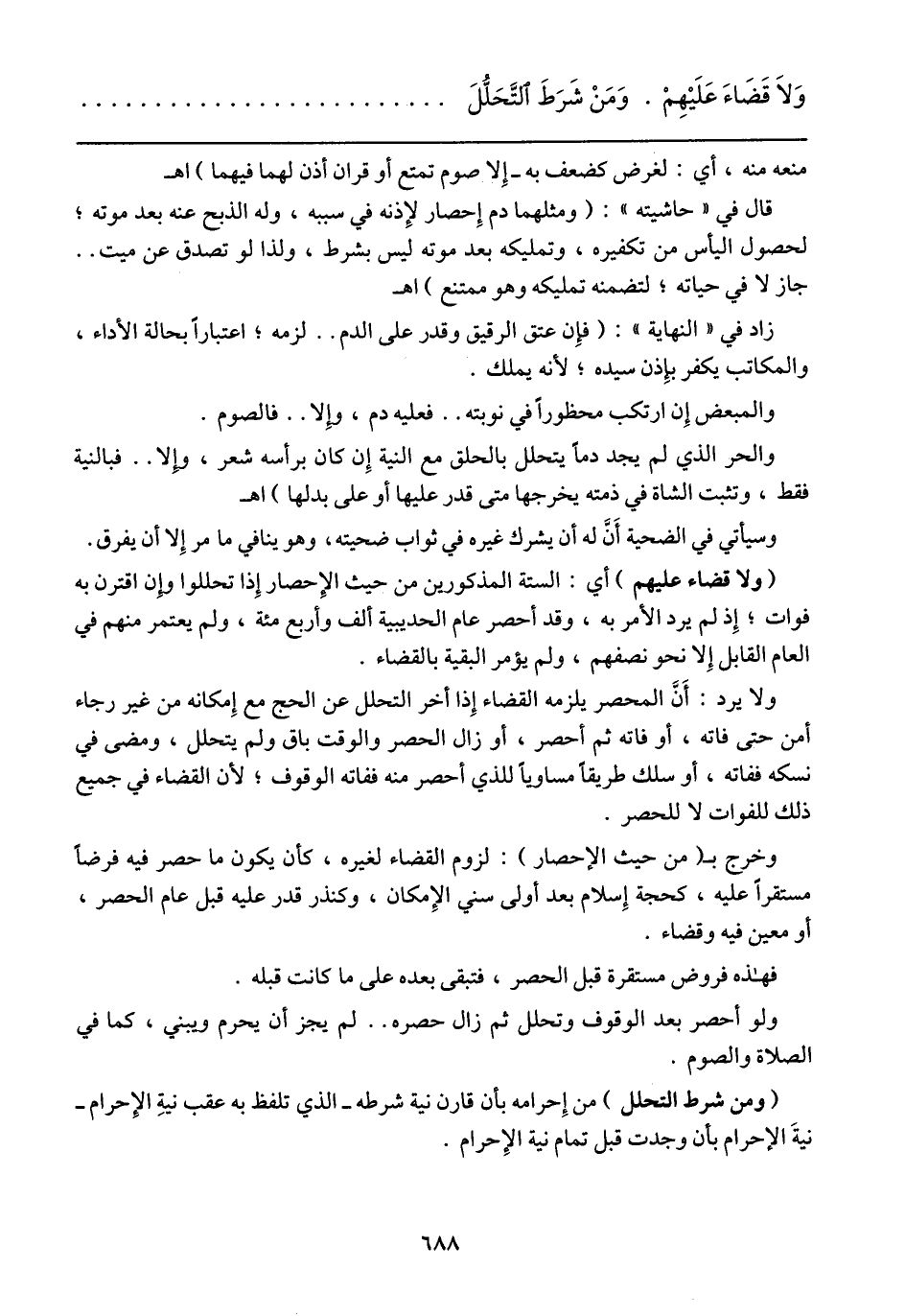 ولا يرد: أنَّ المحصر يلزمه القضاء إذا أخر التحلل عن الحج مع إمكانه من غير رجاء أمن حتى فاته، أو فاته ثم أحصر، أو زال الحصر والوقت باق ولم يتحلل، ومضى في نسكه ففاته، أو سلك طريقاً مساوياً للذي أحصر منه ففاته الوقوف؛ لأن القضاء في جميع ذلك للفوات لا للحصر.