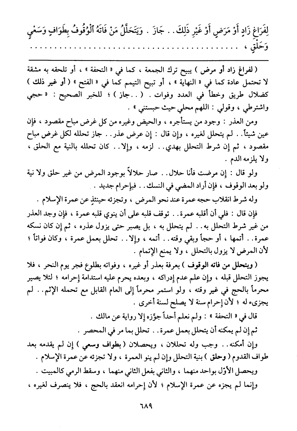 (لفراغ زاد أو مرض) يبيح ترك الجمعة، كما في "التحفة"، أو تلحقه به مشقة لا تحتمل عادة كما في "النهاية"، أو تبيح التيمم كما في "الفتح" (أو غير ذلك) كضلال طريق وخطأ في العدد وفوات. ( .. جاز)؛ للخبر الصحيح: "حجي واشترطي، وقولي: اللهم محلي حيث حبستني".