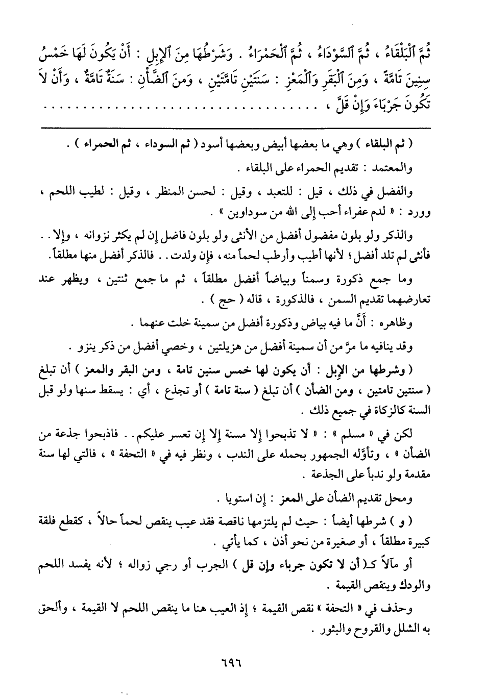 وما جمع ذكورة وسمناً وبياضاً أفضل مطلقاً، ثم ما جمع ثنتين، ويظهر عند تعارضهما تقديم السمن، فالذكورة، قاله (حج).