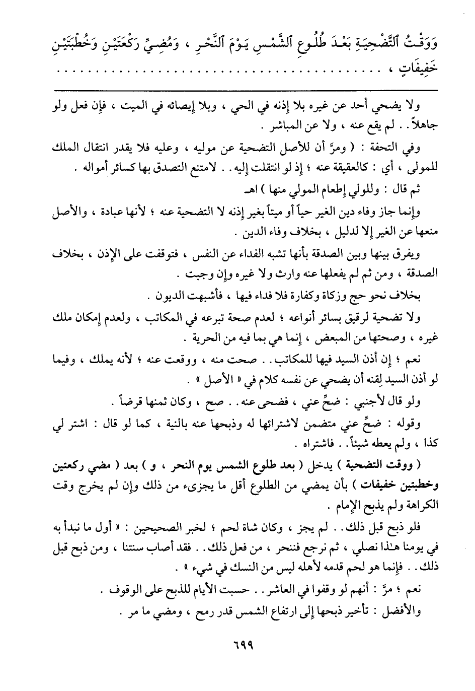 (ووقت التضحية) يدخل (بعد طلوع الشمس يوم النحر، و) بعد (مضي ركعتين وخطبتين خفيفات) بأن يمضي من الطلوع أقل ما يجزئ من ذلك وإن لم يخرج وقت الكراهة ولم يذبح الإمام.