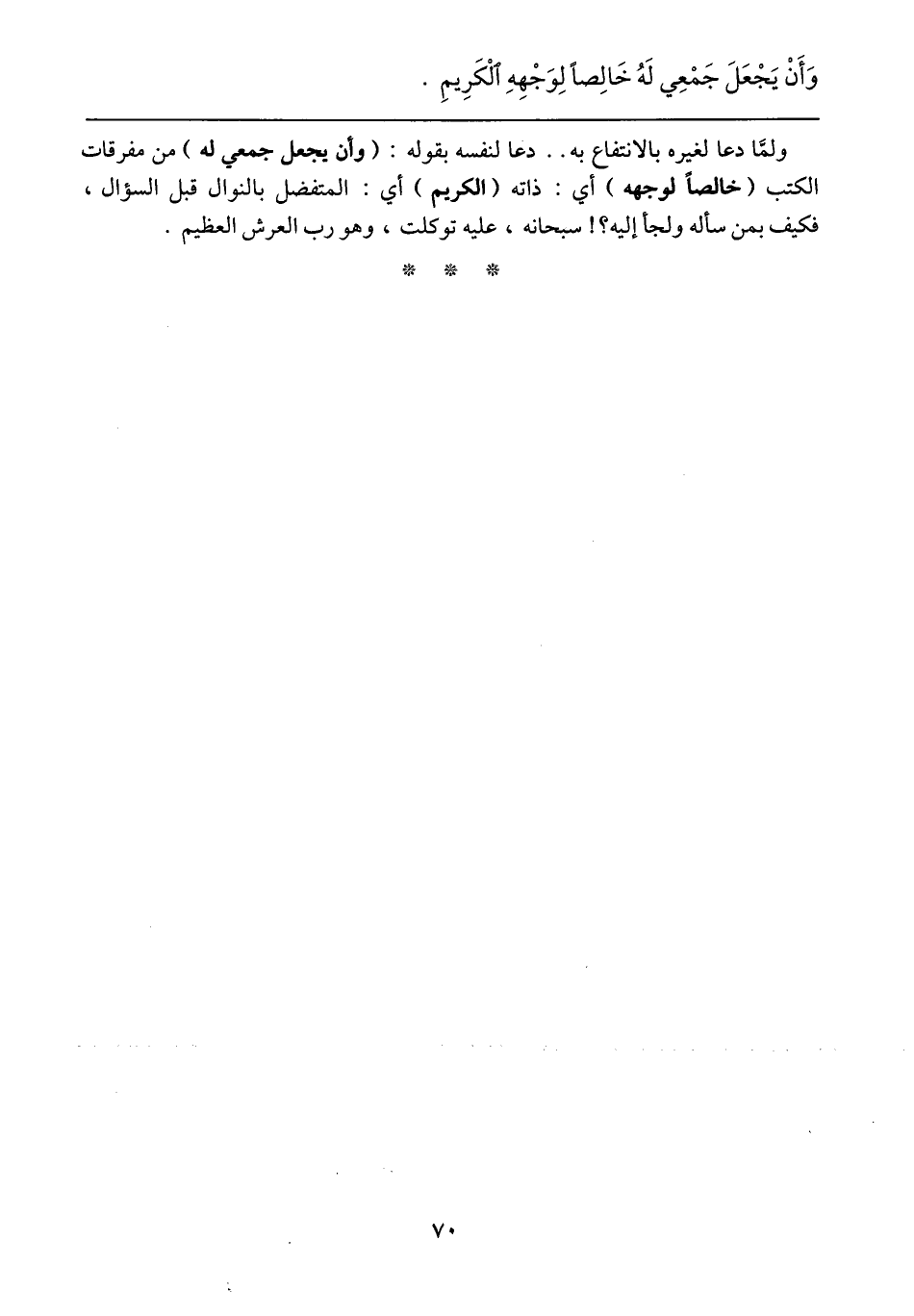 ولمّا دعا لغيره بالانتفاع به .. دعا لنفسه بقوله: (وأن يجعل جمعي له) من مفرقات الكتب (خالصاً لوجهه) أي: ذاته (الكريم) أي: المتفضل بالنوال قبل السؤال، فكيف بمن سأله ولجأ إليه؟! سبحانه، عليه توكلت، وهو رب العرش العظيم.