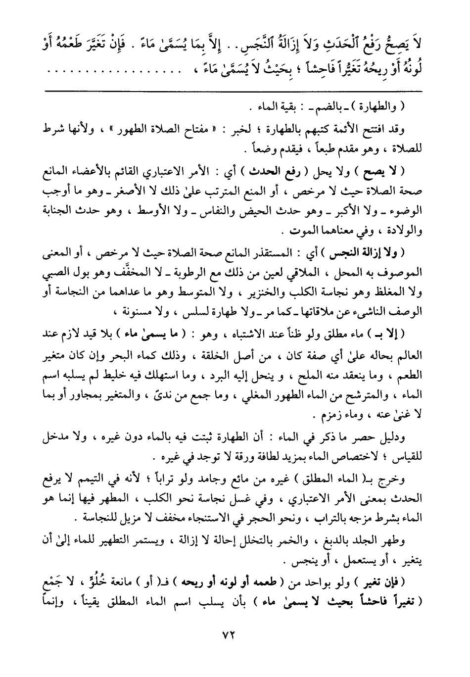 (إلا بـ) ماء مطلق ولو ظناً عن الاشتباه، وهو: (ما يسمى ماء) بلا قيد لازم عند العالم بحاله على أي صفة كان، من أصل الخلقة، وذلك كماء البحر وإن كان متغير الطعم، وما ينعقد منه الملح، وينحل إليه البرد، وما استهلك فيه خليط لم يسلبه اسم الماء، والمترشح من الماء الطهور المغلي، وما جمع من ندىً، والمتغير بمجاور أو بما لا غنى عنه، وماء زمزم.