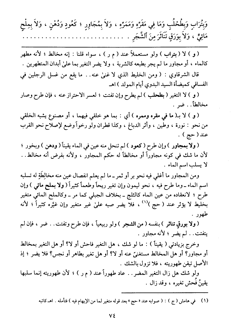 ومن المجاور ما أغلي فيه نحو بر أو ثمر -ما لم يعلم انفصال عين منه مخالطة له تسلبه اسم الماء- وما طرح فيه، نحو ليمون وإن تغير ريحاً وطعماً كثيراً (ولا بملح مائي) وإن طرح؛ لانعقاده من عين الماء كالثلج -بخلاف الجبلي كما مر- وكالملح المائي متغير بخليط لا يؤثر عند (حج)، فلا يضر صبه على غير متغير وإن غيره كثيراً؛ لانه طهور.