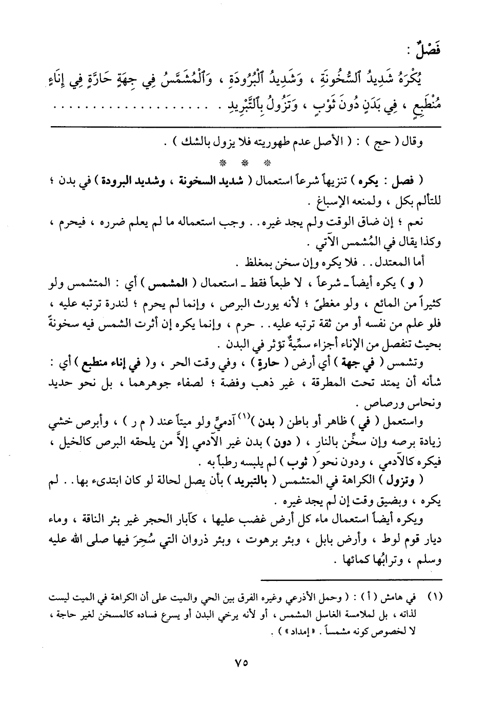 (فصل: يكره) تنزيهاً شرعاً استعمال (شديد السخونة، وشديد البرودة) في بدن؛ للتألم بكل، ولمنعه الإسباغ.