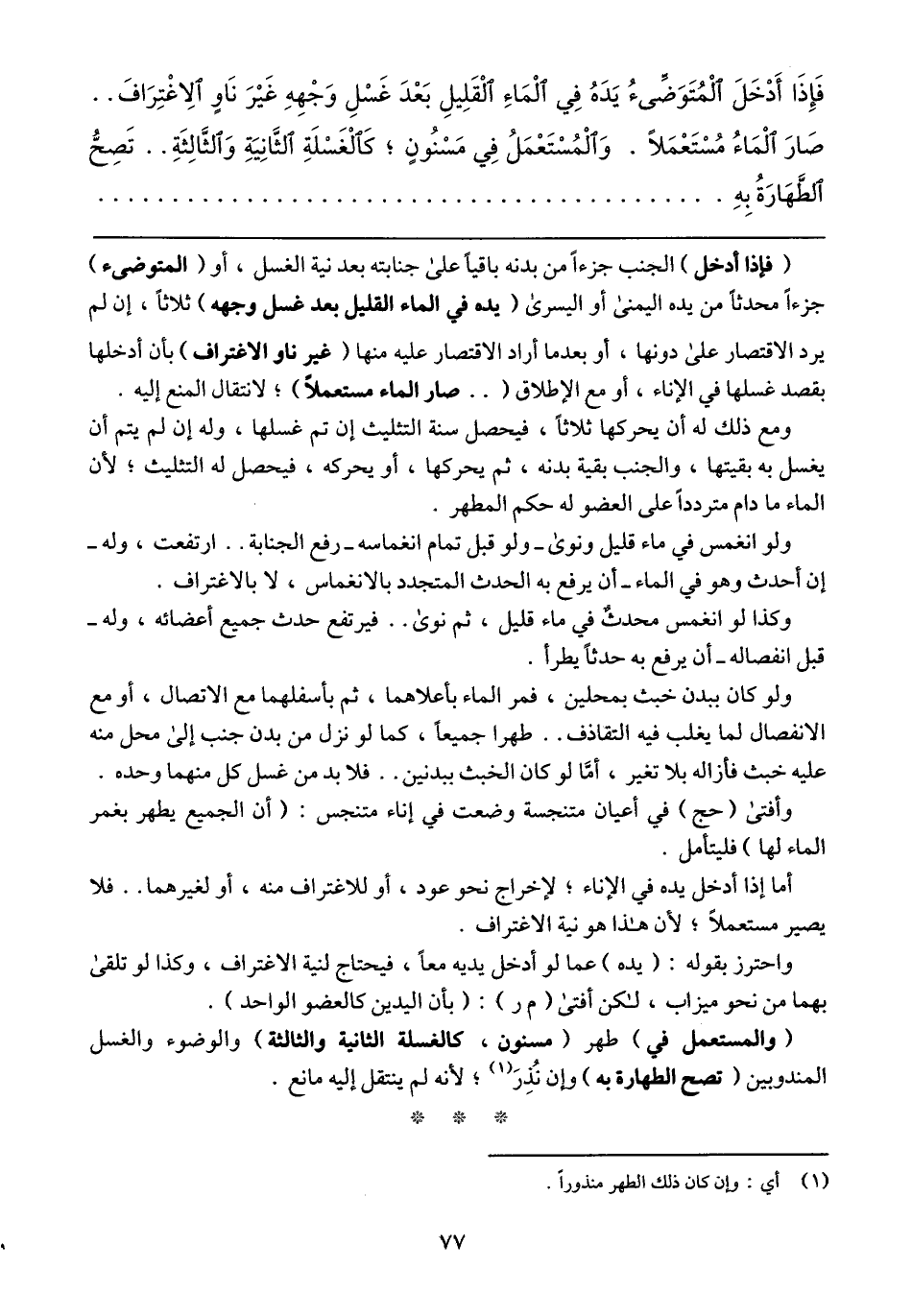 (فإذا أدخل) الجنب جزءاً من بدنه باقياً على جنابته بعد نية الغسل، أو (المتوضىء) جزءاً محدثاً من يده اليمنى أو اليسرى (يده في الماء القليل بعد غسل وجهه) ثلاثاً، إن لم يرد الاقتصار على دونها، أو بعدما أراد الاقتصار عليه منها (غير ناو الاغتراف) بأن أدخلها بقصد غسلها في الإناء، أو مع الإطلاق ( .. صار الماء مستعملاً)؛ لانتقال المنع إليه.
