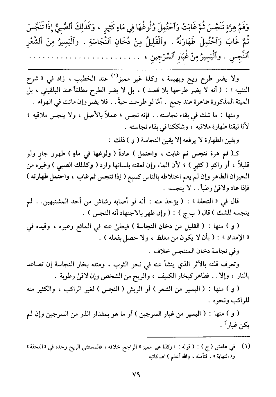وتعرف قلته بالأثر الذي ينشأ عنه في نحو الثوب، ومثله بخار النجاسة إن تصاعد بالنار، وإلا .. فطاهر كبخار الكنيف، والريح من الشخص وإن لاقى رطوبة.