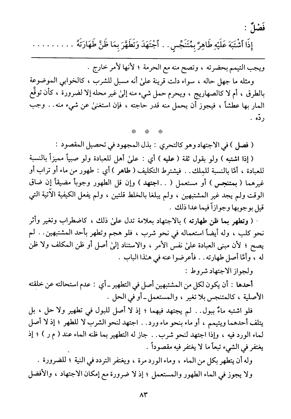 فلو اشتبه ماءٌ ببول .. لم يجتهد فيهما؛ إذ لا أصل في البول في تطهير ولا حل، بل يتلف أحدهما ويتيمم، أو ما بنحو ماء ورد .. اجتهد لنحو الشرب لا للطهر؛ إذ لا أصل لماء الورد فيه، وإذا اجتهد لنحو شرب .. جاز له التطهير بما ظنه الماء عند (م ر)؛ إذ يغتفر في الشيء تبعاً ما لا يغتفر فيه مقصوداً.