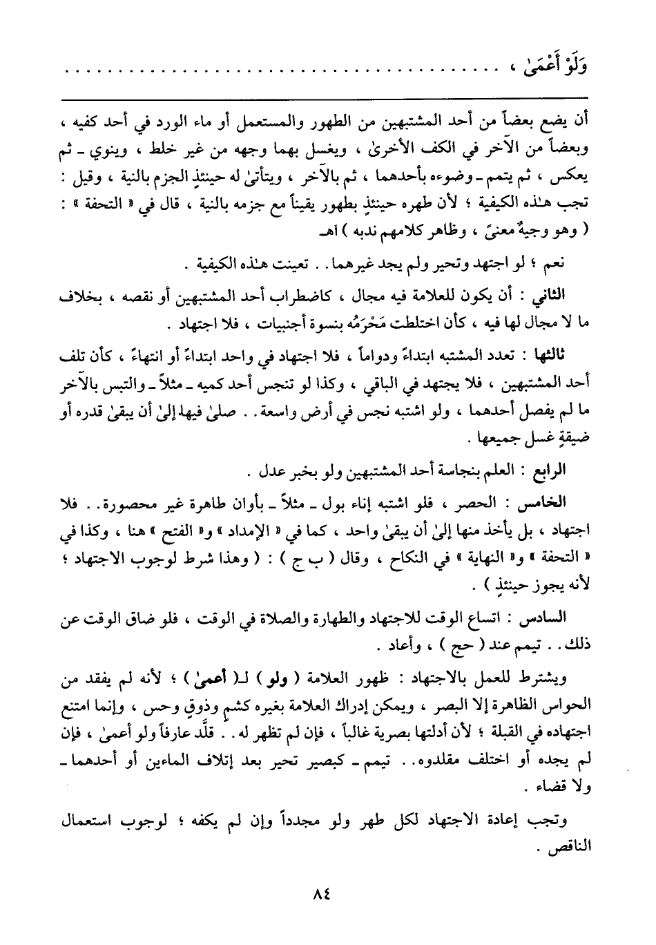 ويشترط للعمل بالاجتهاد: ظهور العلامة (ولو) لـ (أعمى)؛ لأنه لم يفقد من الحواس الظاهرة إلا البصر، ويمكن إدراك العلامة بغيره كشم وذوق وحس، وإنما امتنع اجتهاده في القبلة؛ لأن أدلتها بصرية غالباً، فإن لم تظهر له .. قلد عارفاً ولو أعمى، فإن لم يجده أو اختلف مقلدوه .. تيمم -كبصير تحير بعد إتلاف الماءين أو أحدهما- ولا قضاء.