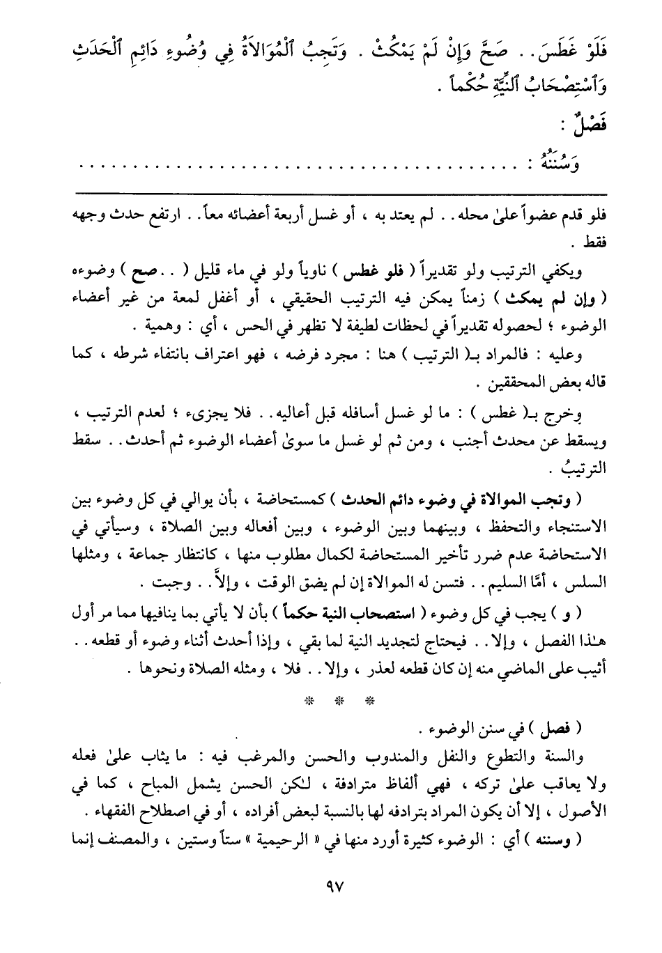 (وتجب الموالاة في وضوء دائم الحدث) كمستحاضة، بأن يوالي في كل وضوء بين الاستنجاء والتحفظ، وبينهما وبين الوضوء، وبين أفعاله وبين الصلاة، وسيأتي في الاستحاضة عدم ضرر تأخير المستحاضة لكمال مطلوب منها، كانتظار جماعة، ومثلها السلس، أما السليم .. فتسن له الموالاة إن لم يضق الوقت، وإلا .. وجبت.