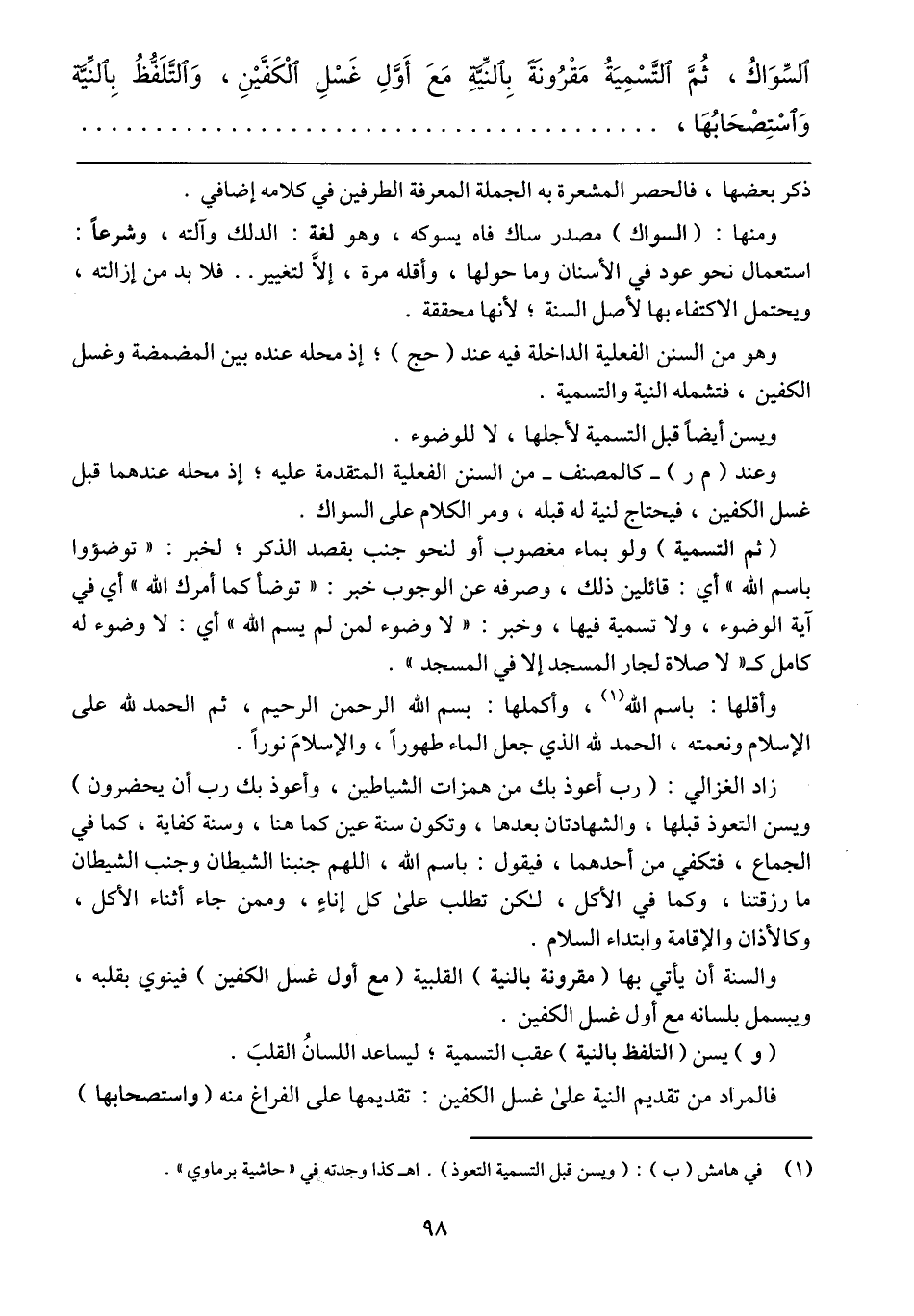 والسنة أن يأتي بها (مقرونة بالنية) القلبية (مع أول غسل الكفين) فينوي بقلبه، ويبسمل بلسانه مع أول غسل الكفين.