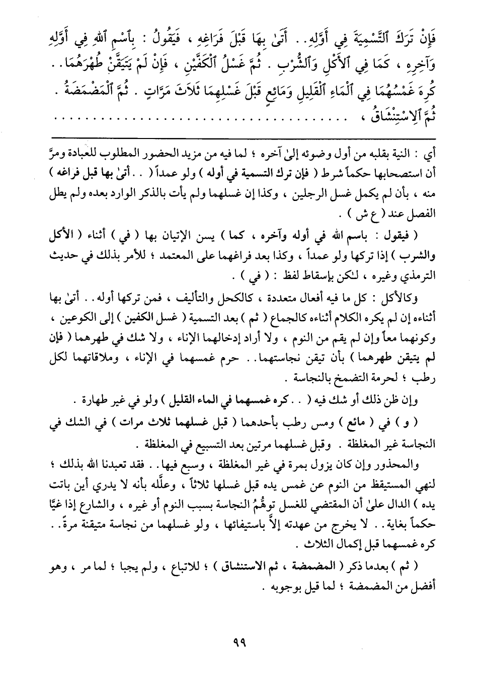 وكالأكل: كل ما فيه أفعال متعددة، كالكحل والتأليف، فمن تركها أوله .. أتى بها أثناءه إن لم يكره الكلام أثناءه كالجماع (ثم) بعد التسمية (غسل الكفين) إلى الكوعين، وكونهما معاً وإن لم يقم من النوم، ولا أراد إدخالهما الإناء، ولا شك في طهرهما (فإن لم يتيقن طهرهما) بأن تيقن نجاستهما .. حرم غمسهما في الإناء، وملاقاتهما لكل رطب؛ لحرمة التضمخ بالنجاسة.