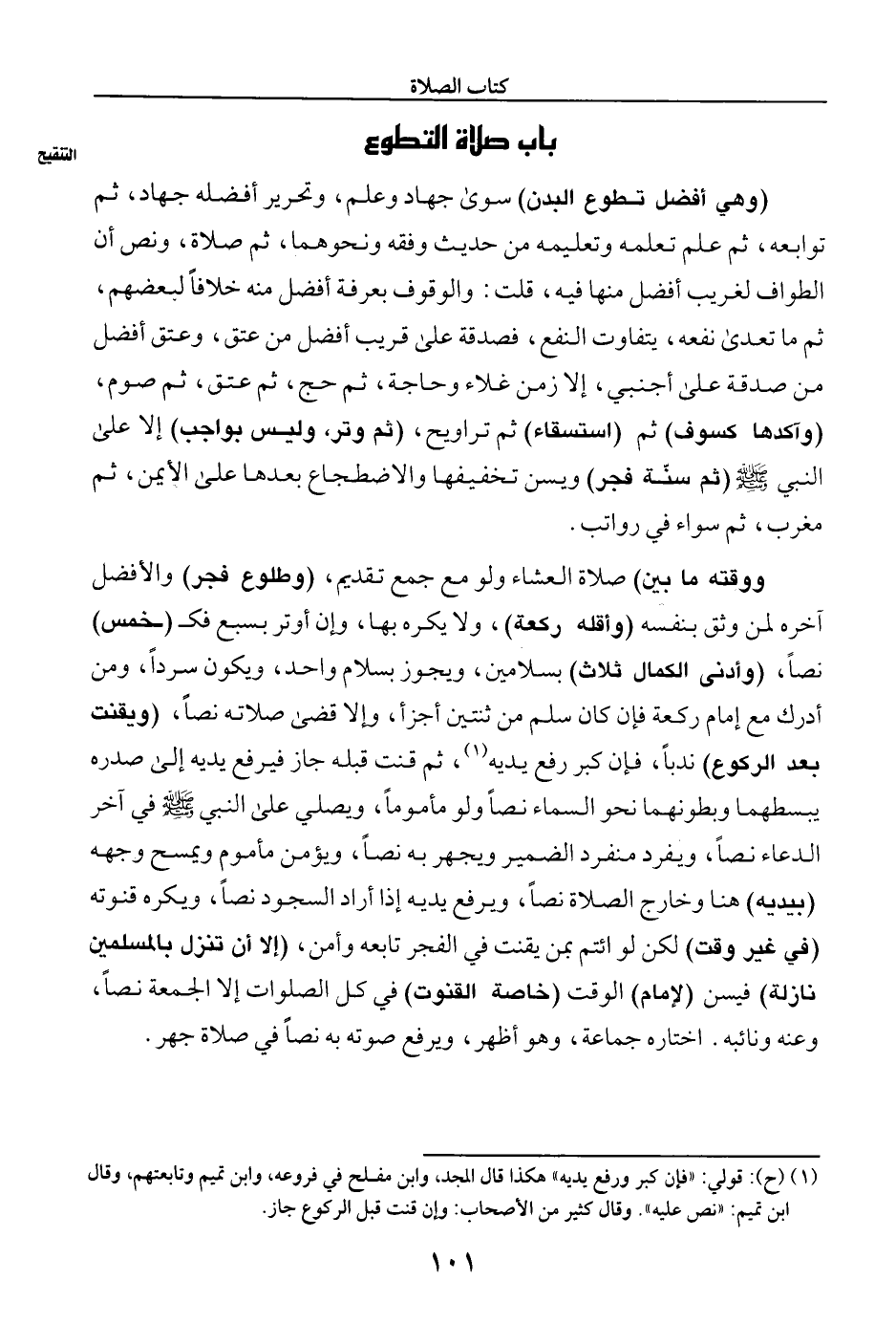 (وهي أفضل تطوع البدن) سوى جهاد وعلم، وتحرير أفضله جهاد، ثم توابعه، ثم علم تعلمه وتعليمه من حديث وفقه ونحوهما، ثم صلاة، ونص أن الطواف لغريب أفضل منها فيه، قلت: والوقوف بعرفة أفضل منه خلافا لبعضهم، ثم ما تعدى نفعه، يتفاوت النفع، فصدقة على قريب أفضل من عتق، وعتق أفضل من صدقة على أجنبي، إلا زمن غلاء وحاجة، ثم حج، ثم عتق، ثم صوم، (وأكدها كسوف) ثم (استسقاء) ثم تراويح، (ثم وتر، وليس بواجب) إلا على النبي صلى الله عليه وسلم (ثم سنة فجر) ويسن تخفيفها والاضطجاع بعدها على الأيمن، ثم مغرب ثم سواء في رواتب.