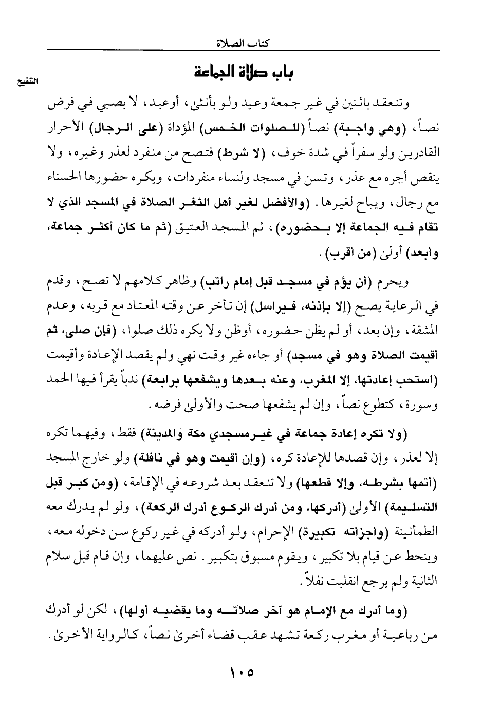 وتنعقد باثنين في غير جمعة وعيد ولو بأنثى أو عبد، لا بصبي في فرض نصا، (وهي واجبة) نصا (للصلوات الخمس) المؤداة (على الرجال) الأحرار القادرين ولو سفرا في شدة خوف، (لا شرط) فتصح من منفرد لعذر وغيره، ولا ينقص أجره مع عذر، وتسن في مسجد ولنساء منفردات، ويكره حضورها الحسناء مع رجال، ويباح لغيرها. (والأفضل لغير أهل الثغر الصلاة في المسجد الذي لا تقام فيه الجماعة إلا بحضوره)، ثم المسجد العتيق (قم ما كان أكثر جماعة، وأبعد) أولى (من أقرب).