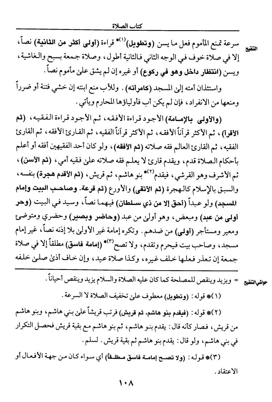 (والأولى بالإمامة) الأجود قراءة الأفقه، ثم الأجود قراءة الفقيه، (ثم الأقرأ)، ثم الأكثر قرآنان الأفقه، ثم الأكثر قرآنا الفقيه، ثم القارئ الأفقه، ثم القارئ الفقيه، ثم القارئ العالم فقه صلاته (ثم الأفقه)، ولو كان أحد الفقيهين أفقه أو أعلم بأحكام الصلاة قدم، ويقدم قارئ لا يعلم فقه صلاته على فقيه أمي، (ثم الأسن)، ثم الأشرف وهو القرشي، فيقدم (¬٢) * بنو هاشم، ثم قريش، (ثم الأقدم هجرة) بنفسه، والسبق بالإسلام كالهجرة (ثم الأتقى) والأورع (ثم قرعة. وصاحب البيت وإمام المسجد) ولو عبدا (أحق إلا من ذي سلطان) فيهما نصا، وسيد في البيت (وحر أولى من عبد) ومبعض، وهو أولى من عبد (وحاضر وبصير) وحضري ومتوضئ ومعير ومستأجر (أولى) من ضدهم. وتكره إمامة غير الأولى بلا إذنه نصا، غير إمام مسجد، وصاحب بيت فيحرم وتقدم، ولا تصح (¬٣) * (إمامة فاسق) مطلقا إلا في صلاة جمعة إن تعذر فعلها خلف غيره، وكذا صلاة عيد، وإن خاف أذى صلى خلفه