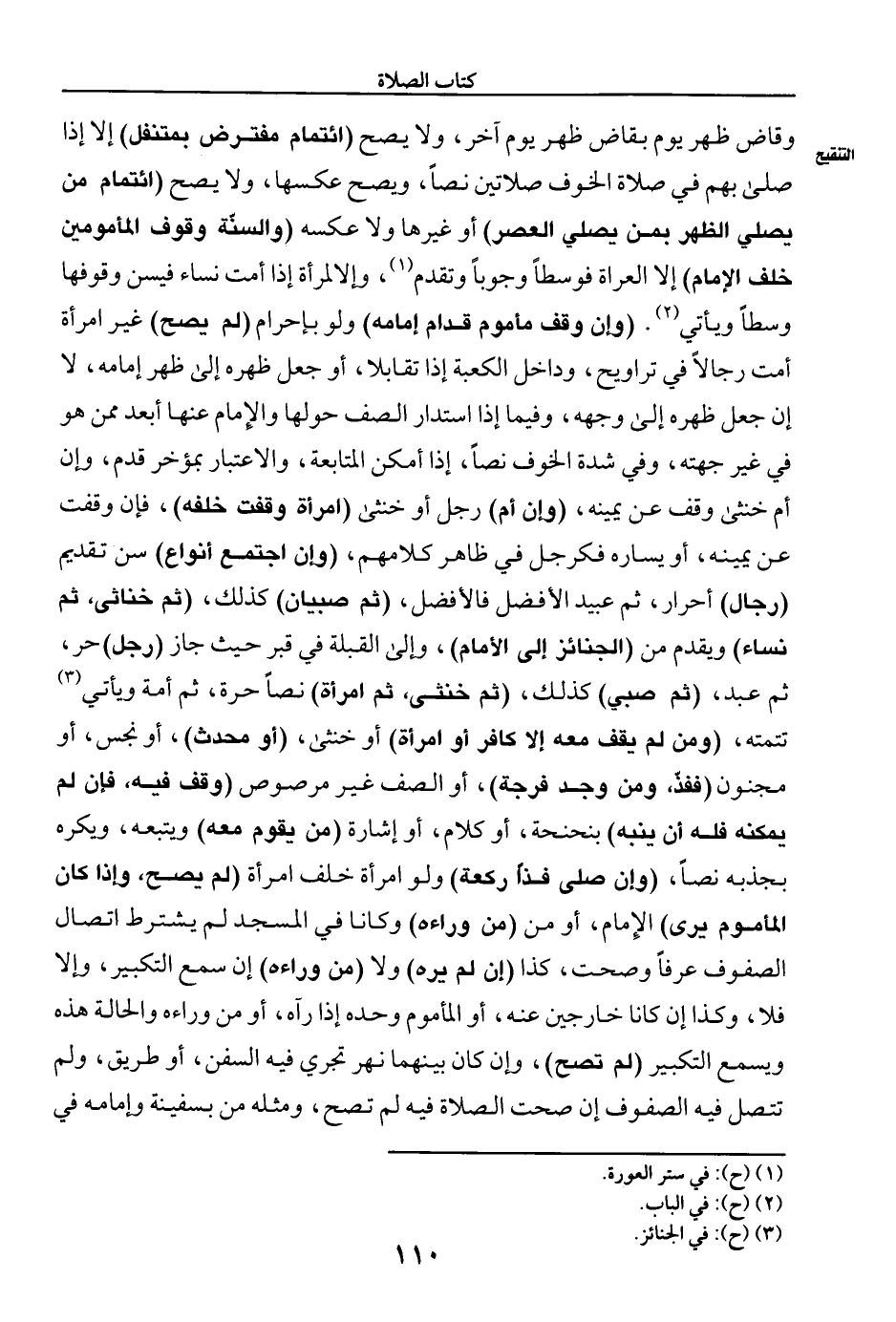 وقاض ظهر يوم بقاض ظهر يوم آخر، ولا يصح (ائتمام مفترض بمتنفل) إلا إذا صلى بهم في صلاة خوف صلاتين نصا، ويصح عكسها، ولا يصح (ائتمام من يصلي الظهر بمن يصلي العصر) أو غيرها ولا عكسه (والسنة وقوف المأمومين خلف الإمام) إلا العراة فوسطا وجوبا وتقدم (¬١)، وإلا لمرأة إذا أمت نساء فيسن وقوفها وسطا ويأتي (¬٢). (وإن وقف مأموم قدام إمامه) ولو بإحرام (لم يصح) غير امرأة أمت رجالا في تراويح، وداخل الكعبة إذا تقابلا، أو جعل ظهره إلى ظهر إمامه، لا إن جعل ظهره إلى وجهه، وفيما إذا استدار الصف حولها والإمام عنها أبعد ممن هو في غير جهته، وفي شدة الخوف نصا، إذا أمكن المتابعة، والاعتبار بمؤخر القدم، وإن أم خنثى وقف عن يمينه، (وإن أم) رجل أو خنثى (امرأة وقفت خلفه)، فإن وقفت عن يمينه، أو يساره فكرجل في ظاهر كلامهم، (وإن اجتمع أنوع) سن تقديم (رجال) أحرار، ثم عبيد الأفضل فالأفضل، (ثم صبيان) كذلك، (ثم خناثي، ثم نساء) ويقجم من (الجنائز إلى الأمام)، وإلى القبلة في قبر حيث جاز (رجل) حر، ثم عبد، (ثم صبي) كذلك، (ثم خنثى، ثم امرأة) نصا حرة، ثم أمة ويأتي (¬٣) تتمته، (ومن لم يقف معه إلا كافر أو امرأة) أو خنثى، (أو محدث)، أو نجسن أو مجنون (ففذّ، ومن وجد فرجة)، أو الصف غير مرصوص (وقف فيه، فإن لم يمكنه فله أن ينبه) بنحنحة، أو كلام، أو إشارة (من يقوم معه) ويتبعه، ويكره بجذبه نصا، (وإن صلى فذا ركعة) ولو امرأة خلف امرأة (لم يصح، وإذا كان المأموم يرى) الإمام، أو من (من وراءه) وكانا في المسجد لم يشترط اتصال الصفوف عرفا وصحت، كذا (إن لم يره) ولا (من وراءه) إن سمع التكبير، وإلا فلا، وكذا إن كانا خارجين عنه، أو المأموم وحده إذا رآه، أو من وراءه والحالة هذه ويسمع التكبير (لم تصح)، وإن كان بينهما نهر تجري في السفن، أو طريق، ولم تتصل فيه الصفوف إن صحت الصلاة فيه لم تصح، ومثله من بسفينة وإمامه في