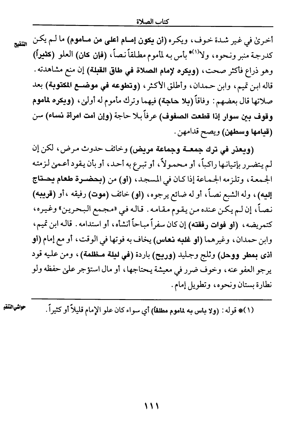أخرى في غير شدة خوف، ويكره (أن يكون إمام أعلى من مأموم) ما لم يكن كدرجة منبر ونحوه، ولا (¬١) * بأس به لمأموم مطلقا نصا، (فإن كان) العلو (كثيرا) وهو ذراع فأكثر صحت، (ويكره لإمام الصلاة في طاق القبلة) إن منع مشاهدته. قاله ابن تميم، وابن حمدان، وأطلق الأكثر، (وتطوعه في موضع المكتوبة) بعد صلاتها قال بعضهم: وفاقا (بلا حاجة) فيهما وترك مأموم له أولى، (ويكره لمأموم وقف بين سوار إذا قطعت الصفوف) عرفا بلا حاجة (وإن أمت امرأة نساء) سن (قيامها وسطهن) ويصح قدامهن.