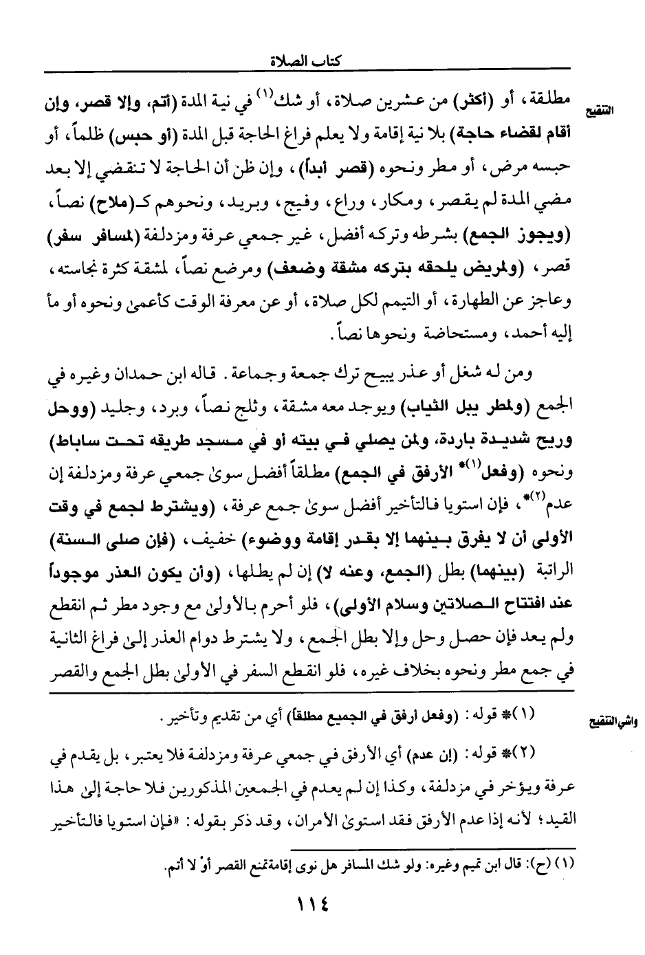 ومن له شغل أو عذر يبيح ترك جمعة وجماعة. قاله ابن حمدان وغيره في الجمع (ولمطر يبل الثياب) ويوجد معه مشقة، وثلج نصا، وبرد، وجليد (ووحل وريح شديدة باردة، ولمن يصلي في بيته أو في مسجد طريقه تحت ساباط) ونحوه (وفعل (¬١) * الأرفق في الجمع) مطلقا أفضل سوى جمعي عرفة ومزدلفة إن عدم (¬٢) *، فإن استويا فالتأخير أفضل سوى جمع عرفة، (ويشترط لجمع في وقت الأولى أن لا يفرق بينهما إلا بقدر إقامة ووضوء) خفيف، (فإن صلى السنة) الراتبة (بينهما) بطل (الجمع، وعنه لا) إن لم يطلها، (وأن يكون العذر موجودا عند افتتاح الصلاتين وسلام الأولى)، فلو أحرم بالأولى مع وجود مطر ثم انقطع ولم يعد فإن حصل وحل وإلا بطل الجمع، ولا يشترط دوام العذر إلى فراغ الثانية في جمع مطر ونحوه بخلاف غيره، فلو انقطع السفر في الأولى بطل الجمع والقصر