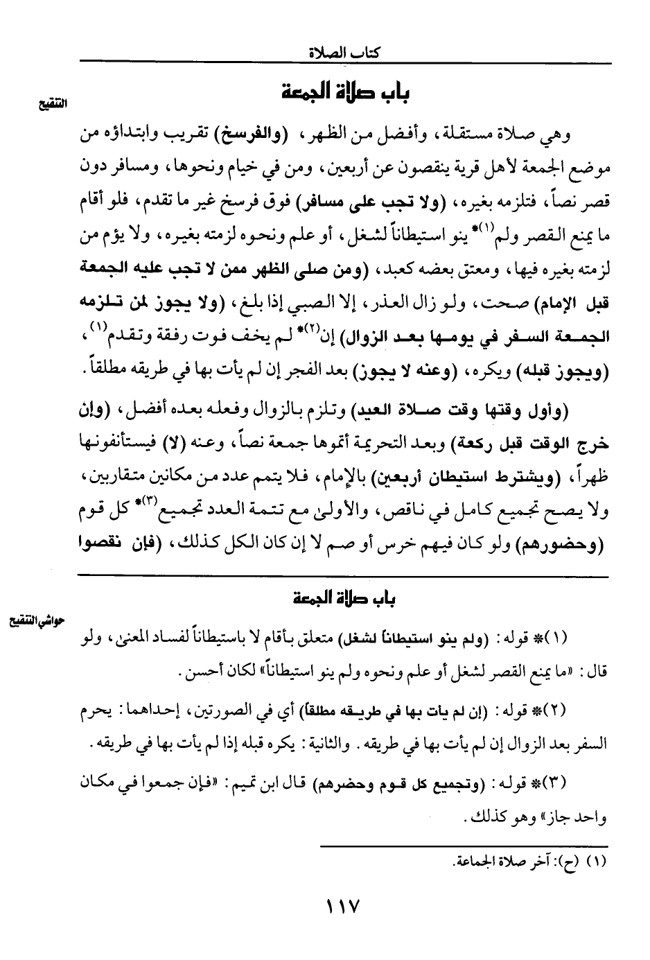 وهي صلاة مستقلة، وأفضل من الظهر، (والفرسخ) تقريب وابتداؤه من موضع الجمعة لأهل قرية ينقصون عن أربعين، ومن في خيام ونحوها، ومسافر دون قصر نصا، فتلزمه بغيره، (ولا تجب على مسافر) فوق فرسخ غير ما تقدم، فلو أقام ما يمنع القصر ولم (¬١) * ينو استيطانا لشغل، أو علم ونحوه لزمته بغيره، ولا يؤم من لزمته بغيره فيها، ومعتق بعضه كعبد، (ومن صلى الظهر ممن لا تجب عليه الجمعة قبل الإمام) صحت، ولو زال العذر، إلا الصبي إذا بلغ، (ولا يجوز لمن تلزمه الجمعة السفر في يومها بعد الزوال) إن (¬٢) * لم يخف فوت رفقة وتقدم (¬١)، (ويجوز قبله) ويكره، (وعنه لا يجوز) بعد الفجر إن لم يأت بها في طريقه مطلقا.