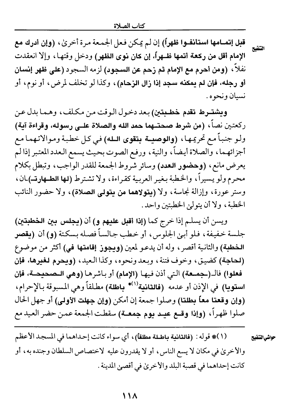 (¬١)* قوله: (فالثانية باطلة مطلقا)، أي سواء كانت إحداهما في المسجد الأعظم والأخرى في مكان لا يسع الناس، أو لا يقدرون عليه لاختصاص السلطان وجنده به، أو كانت إحداهما في قصبة البلد والأخرة في أقصى المدينة.
